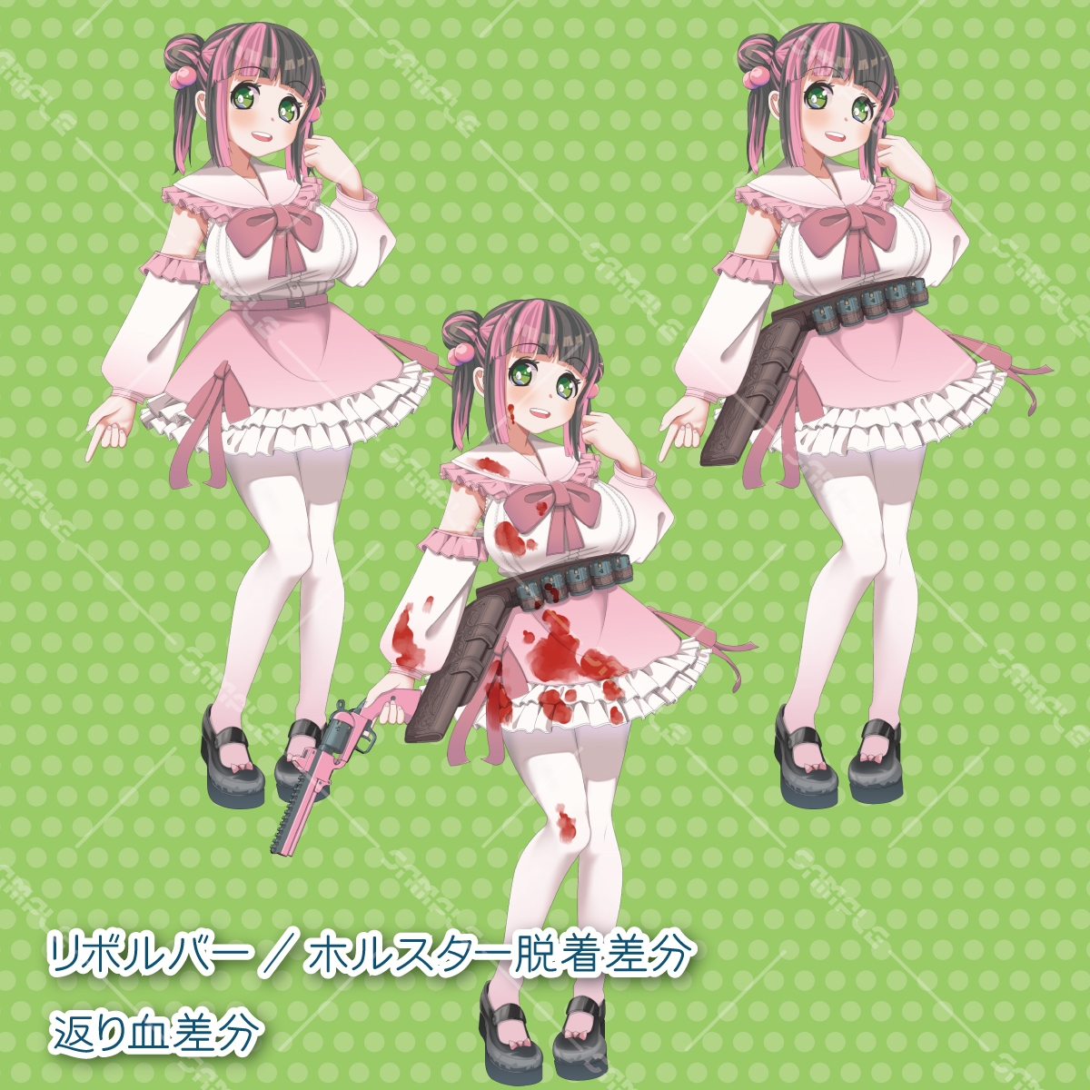 セット内容:立ち絵本体PSD+差分適用済みPNG96枚(表情差分24種×銃アリナシ×髪型2種)+本説明書txt