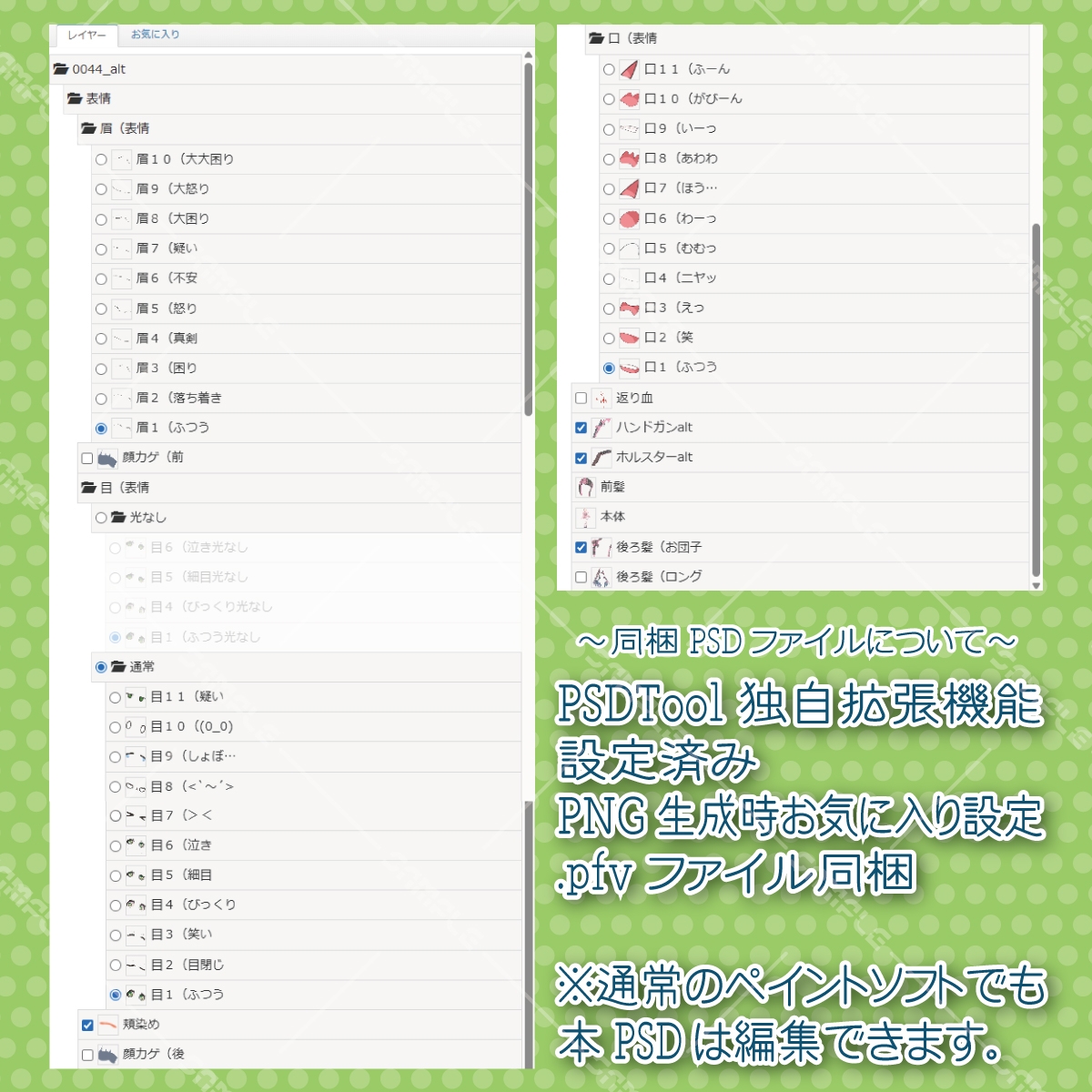 ※PSDToolの独自拡張機能を使用できるように設定しています。おまけでセットのPNG差分作成時のお気に入り設定ファイル(.pfvファイル)も同梱しています。セットPNGの高解像度版や他の表情を作るための下地などにお使いください。