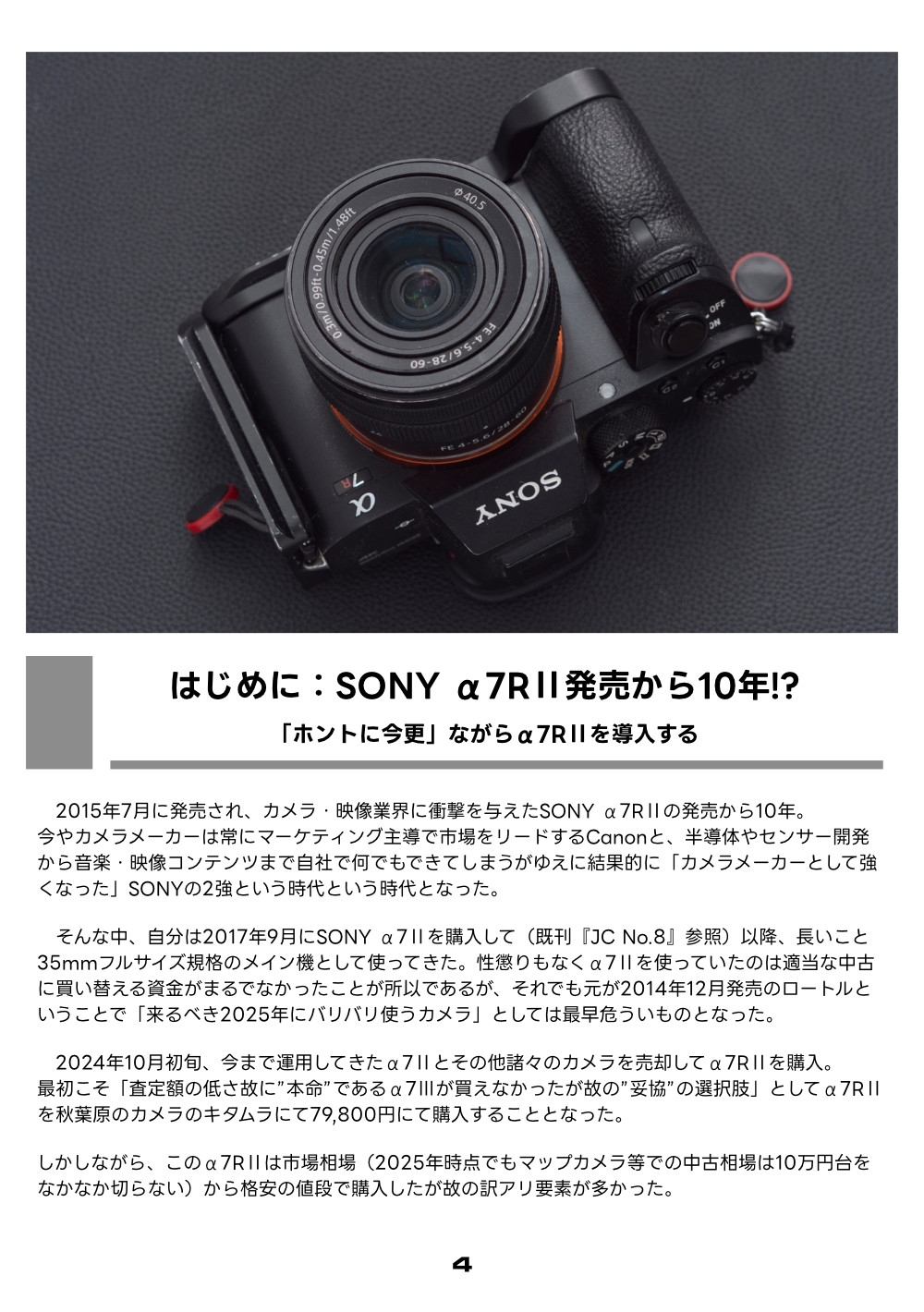 毎度おなじみ泡沫カメラ同人誌『JC Junk Camera』開始と同じ2015年に発売されたフルサイズミラーレス機、SONY α7RIIを「10年遅れ」で購入し、その真価を使っていきながら見つけていく同人誌がここに登場。