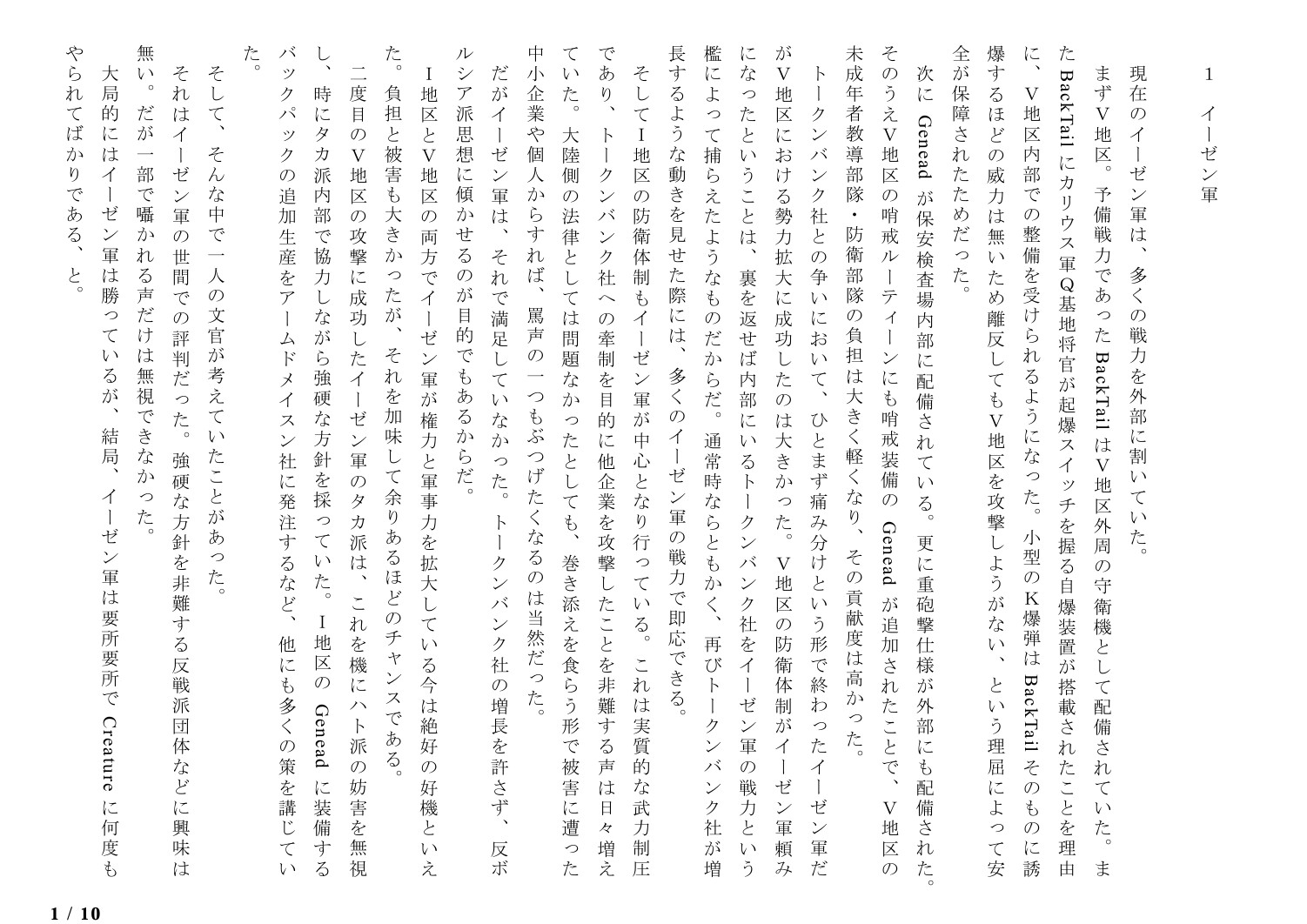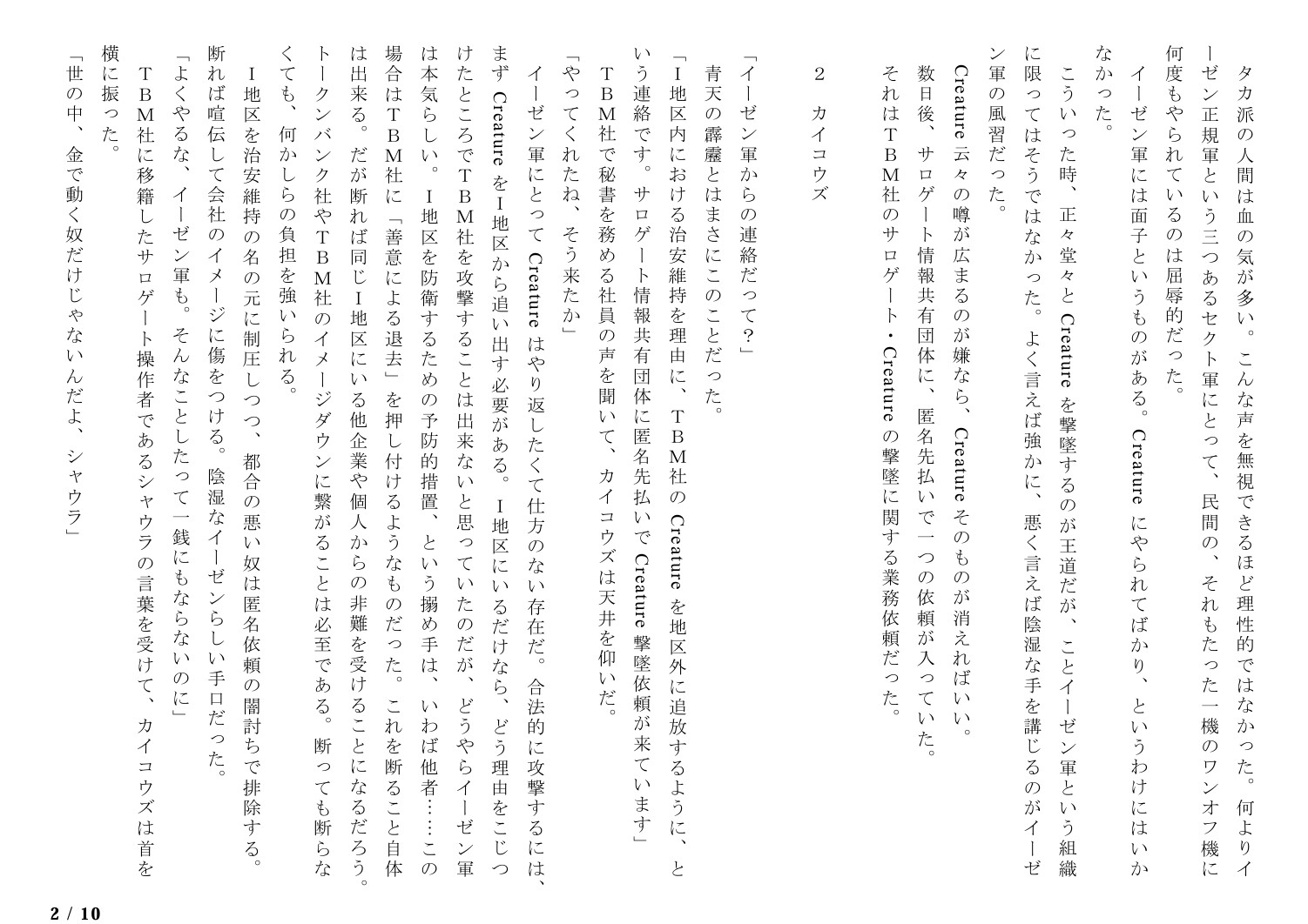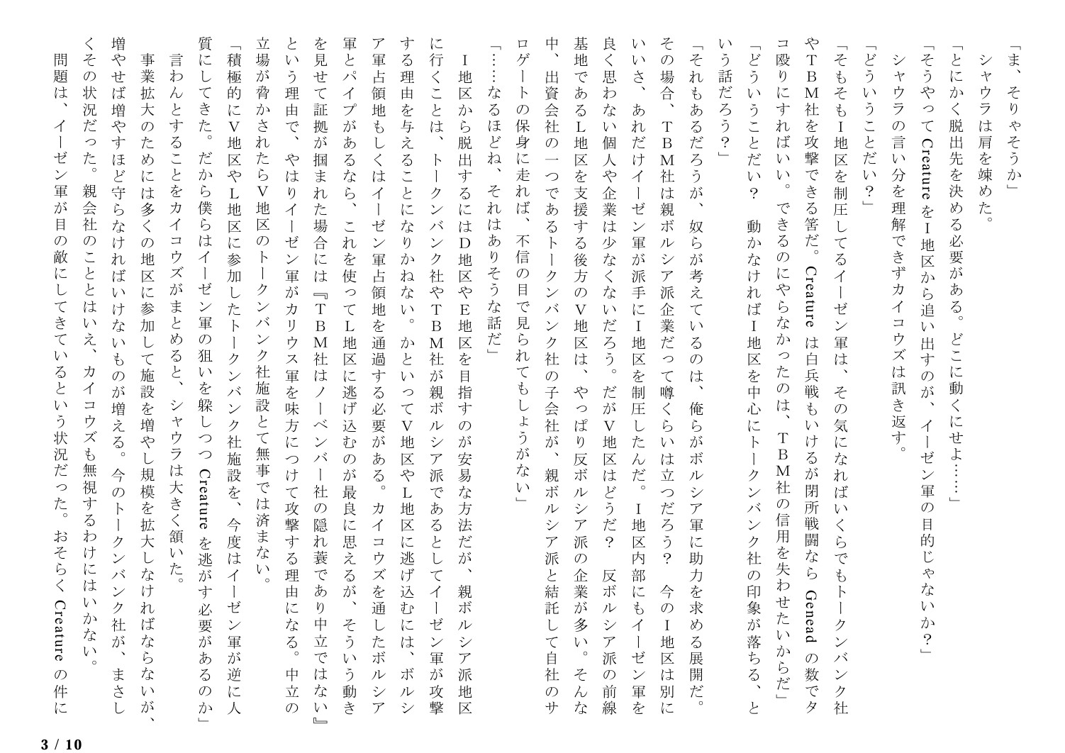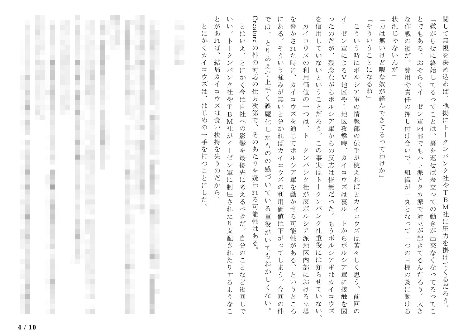 痛み分けで終わったイーゼン軍とトークンバンク社の戦い。二度もTBM社のCreatureに恥をかかされたイーゼン軍は、匿名で民間に働きかけてCreatureの撃墜業務を発注した。さらにイーゼン軍はI地区防衛の予防的措置を理由にTBM社倉庫からCreatureを追い出そうとする。これを受けてカイコウズは手を打つが……?