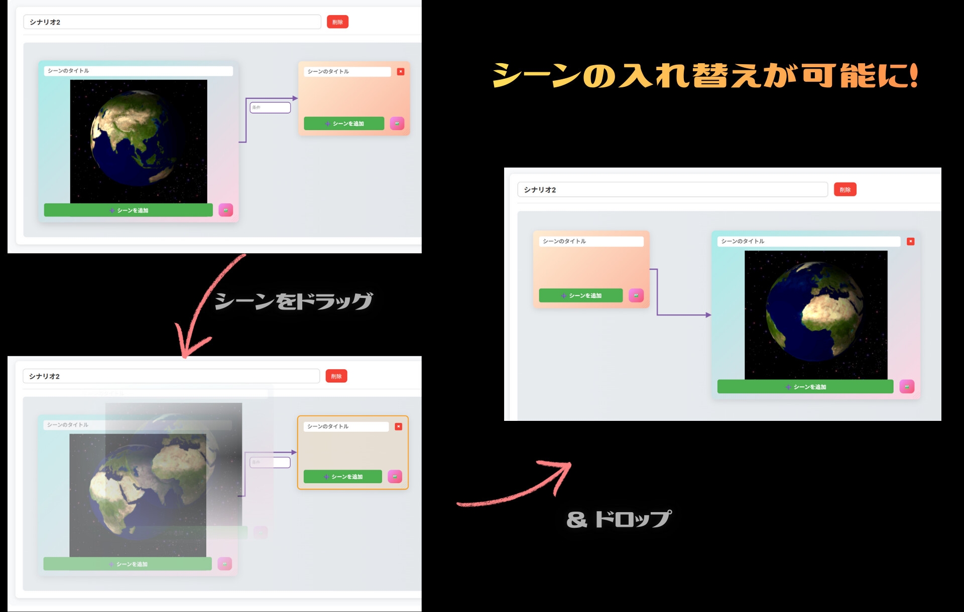 シナリオ作成ボタンを押して、シーンを追加、画像をドラッグ&ドロップしていくだけ!