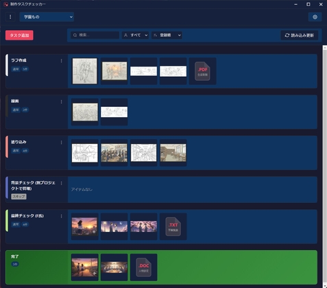 フォルダを指定するだけで、中の画像ファイルを自動で読み込み、サムネイル一覧で表示。あとは「ラフ」「線画」「着色」「仕上げ」など、あなたの制作工程に合わせたタスクを作成するだけ。