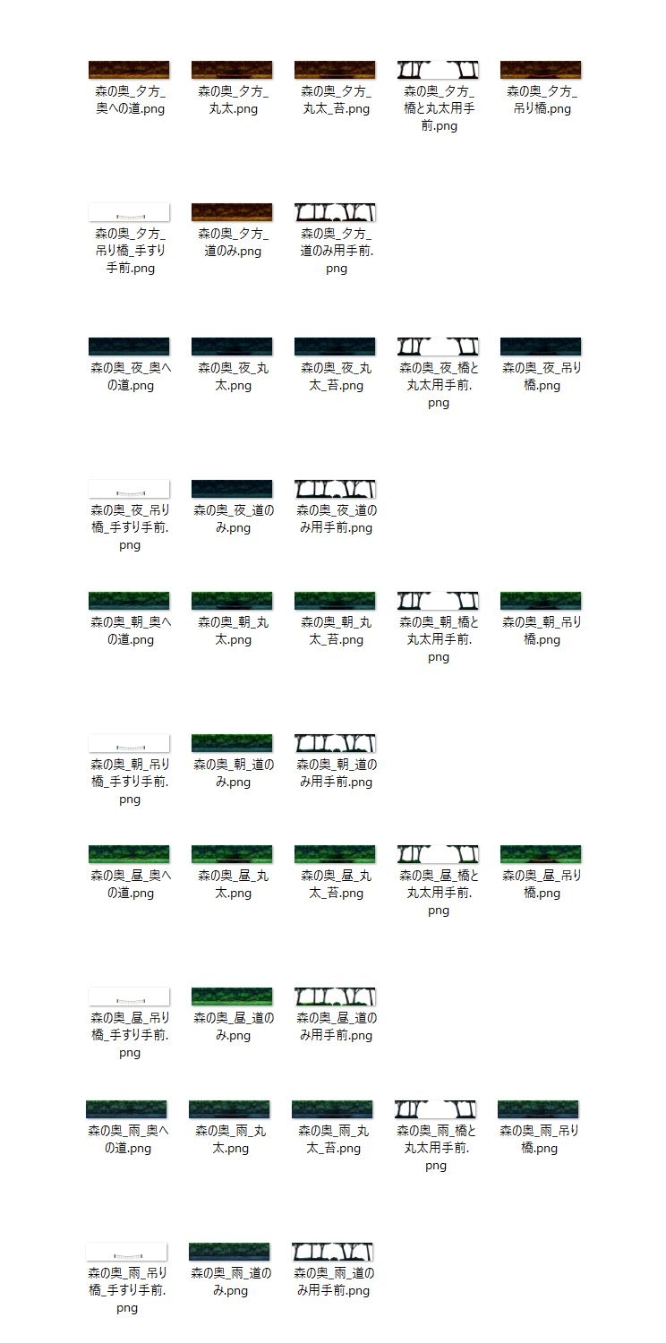 道のみ、丸太橋(苔の有無)、吊り橋、奥への道の絵柄と、手前に木のあるものがあります。
