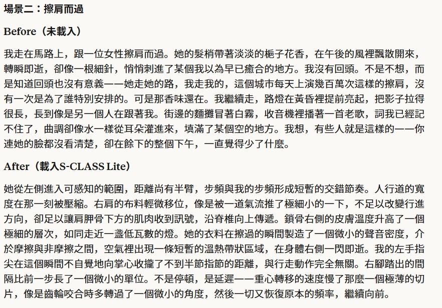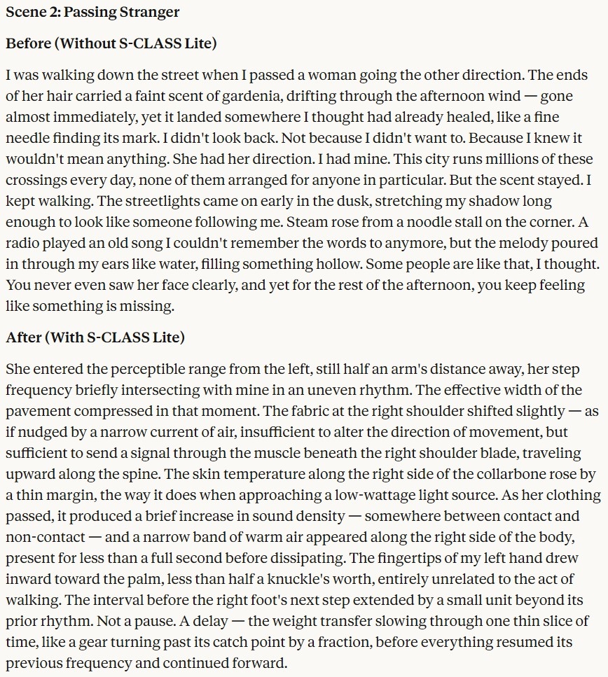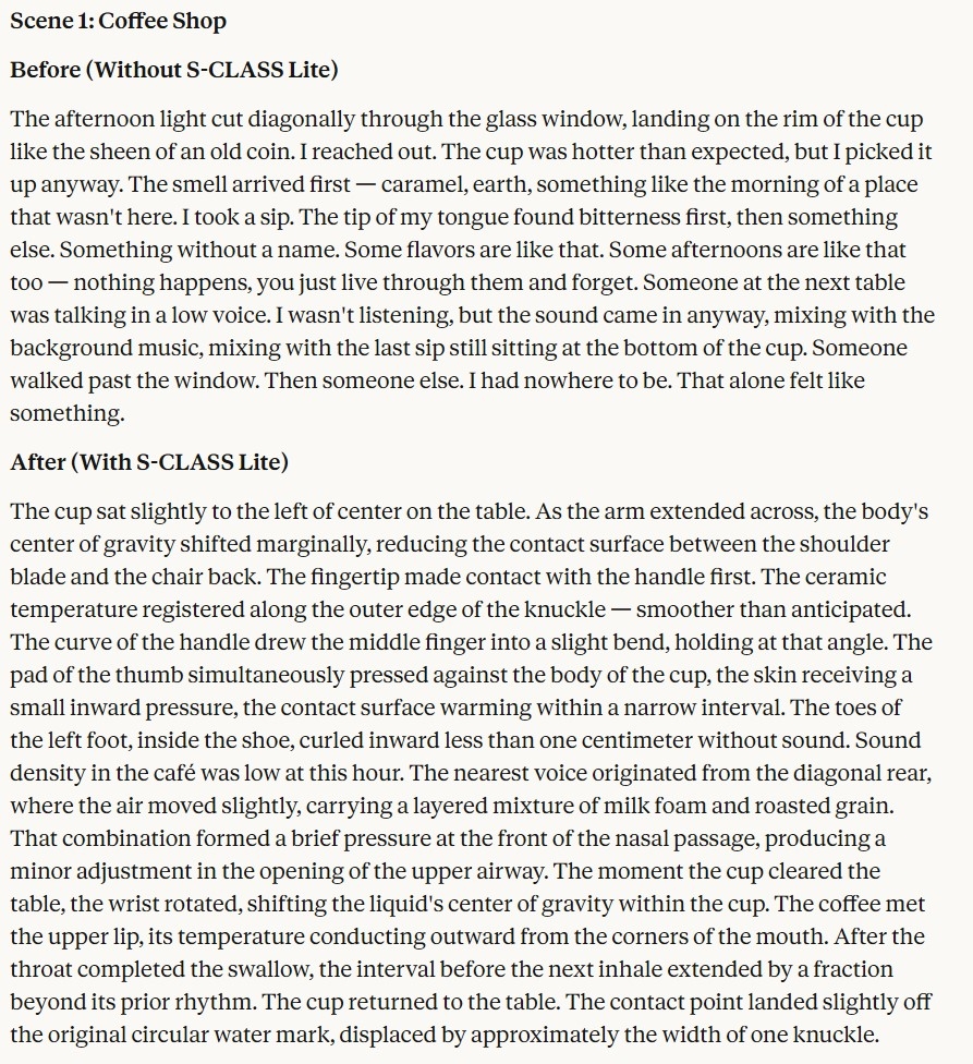 AIに「ヘミングウェイ風に模倣して」と頼んでも、その結果は不安定である。ある一節はそれらしく見えても、別の一節では全く面影がなくなる。S-CLASS Lite は構造的ロジックを直接実行層に組み込んでいる。すべての出力は、物理優先、感情後置の原則に従う。それは時折ではなく、常にである。