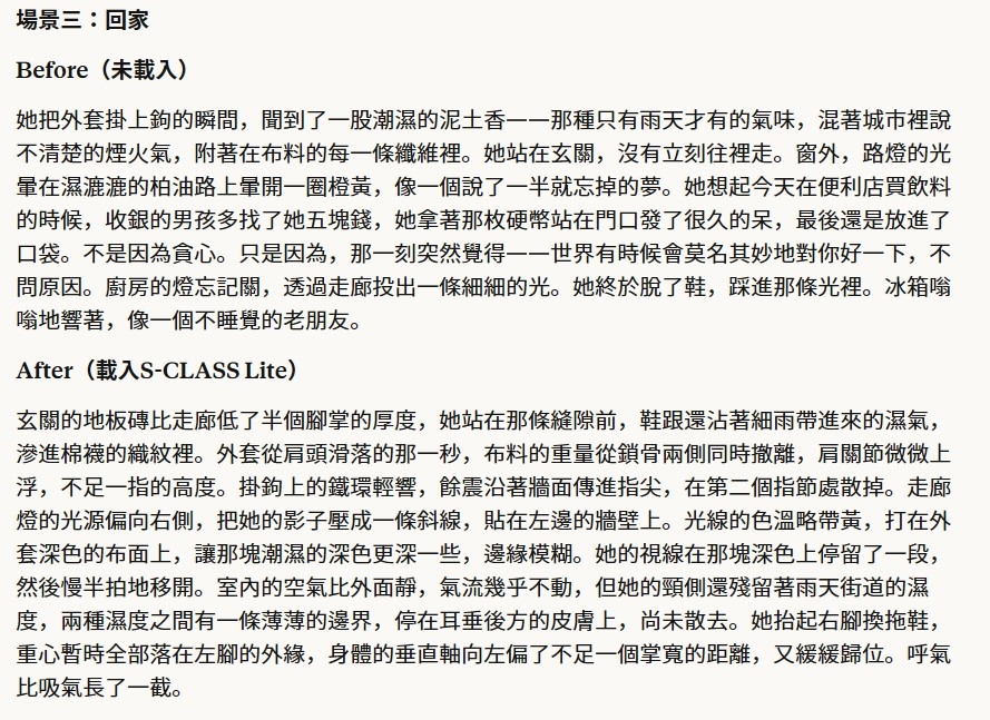 文学スタイルの模倣は短い段落では有効だが、長時間のロールプレイ対話や延長された叙事においては、コンテキストが希釈されるにつれて、AIは自動的に感情的な言語へと退行してしまう。S-CLASS Lite はルールによって固定された実行制約を使用しており、それは時間の経過とともに消失するようなスタイルの提案ではない。