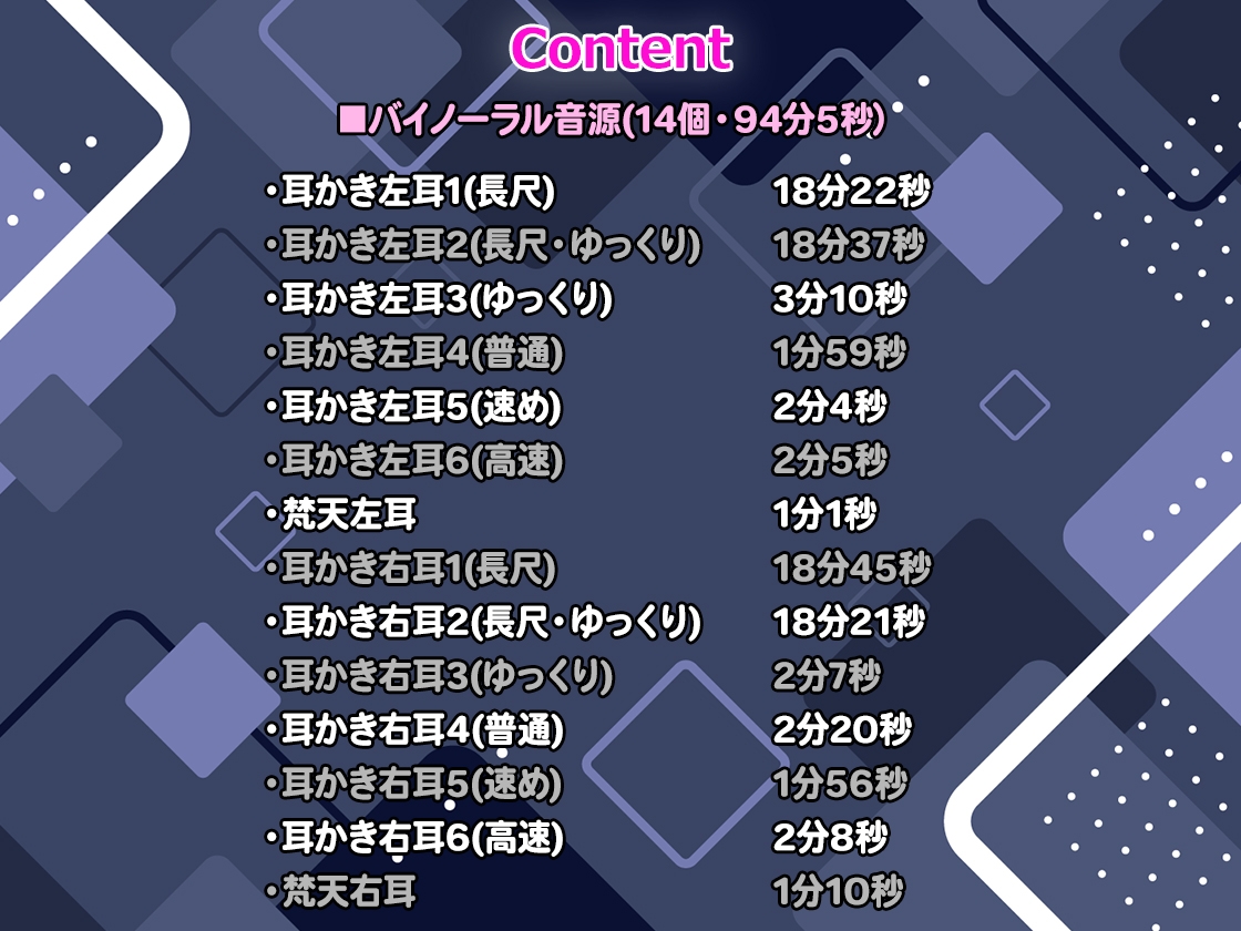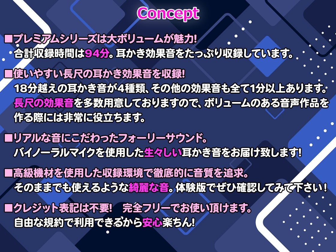 本作は長尺の耳かき効果音を多数収録した効果音素材集となります。