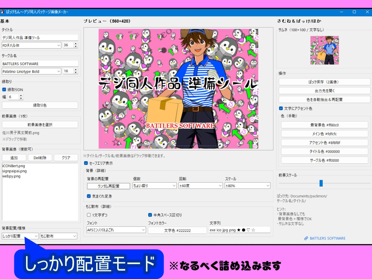 デジタル同人作品向けのパッケージ画像とサムネイルを、直感的な操作で同時に作成できる画像生成ツールです。