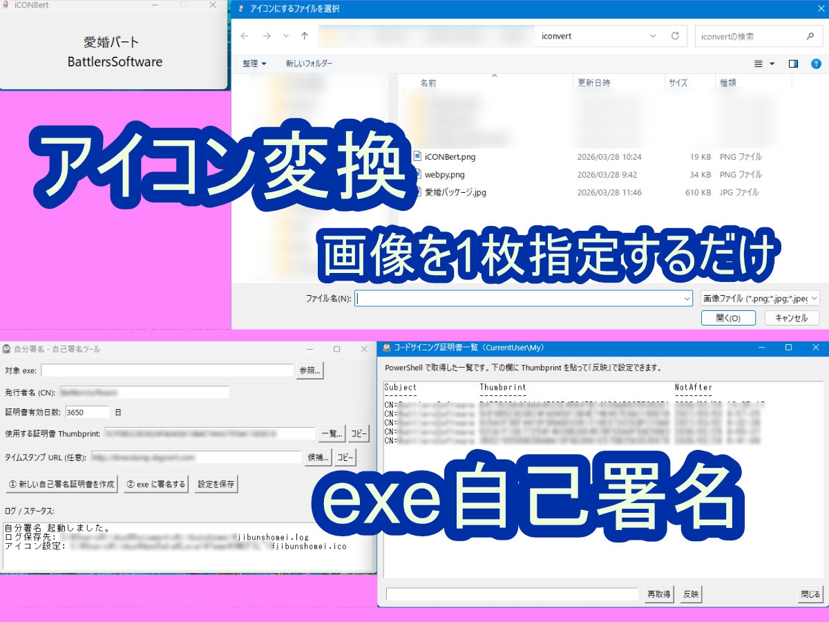 exeファイルに自己署名証明書を付与するための、個人制作者向け署名補助ツールです。
