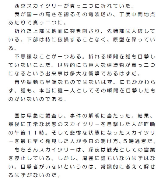 我が国一の高さを誇るその電波塔の、丁度中間地点あたりで真っ二つに。