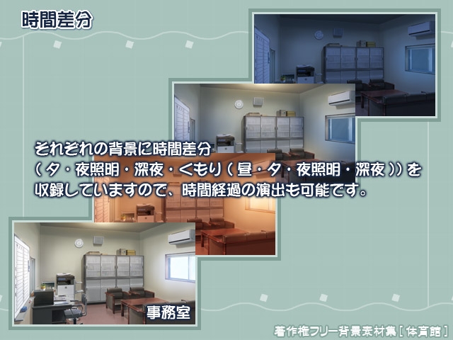 それぞれの背景に時間差分(夕・夜照明・深夜・くもり(昼・夕・夜照明・深夜))を用意してますので、時間経過の演出も可能です。