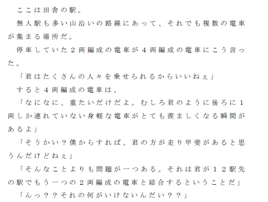 4両編成の電車と2両編成の電車が会話していた。