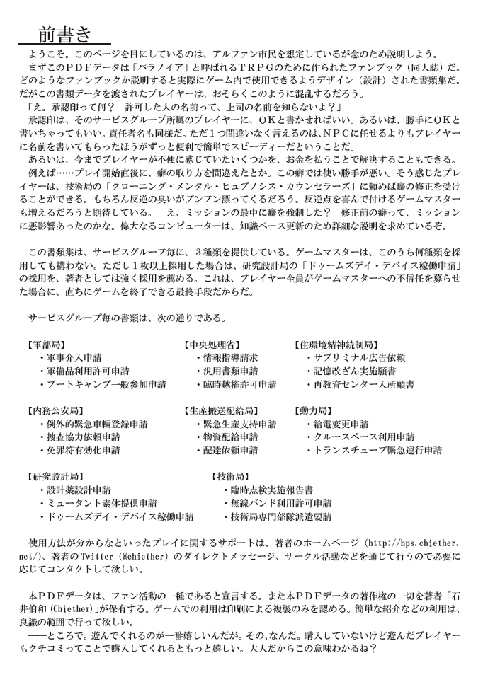 パラ○イア(TRPG)で実際に遊べることを意識して作られた書類集。サービスグループ毎に、3種類ずつ。合計24枚が含まれています。