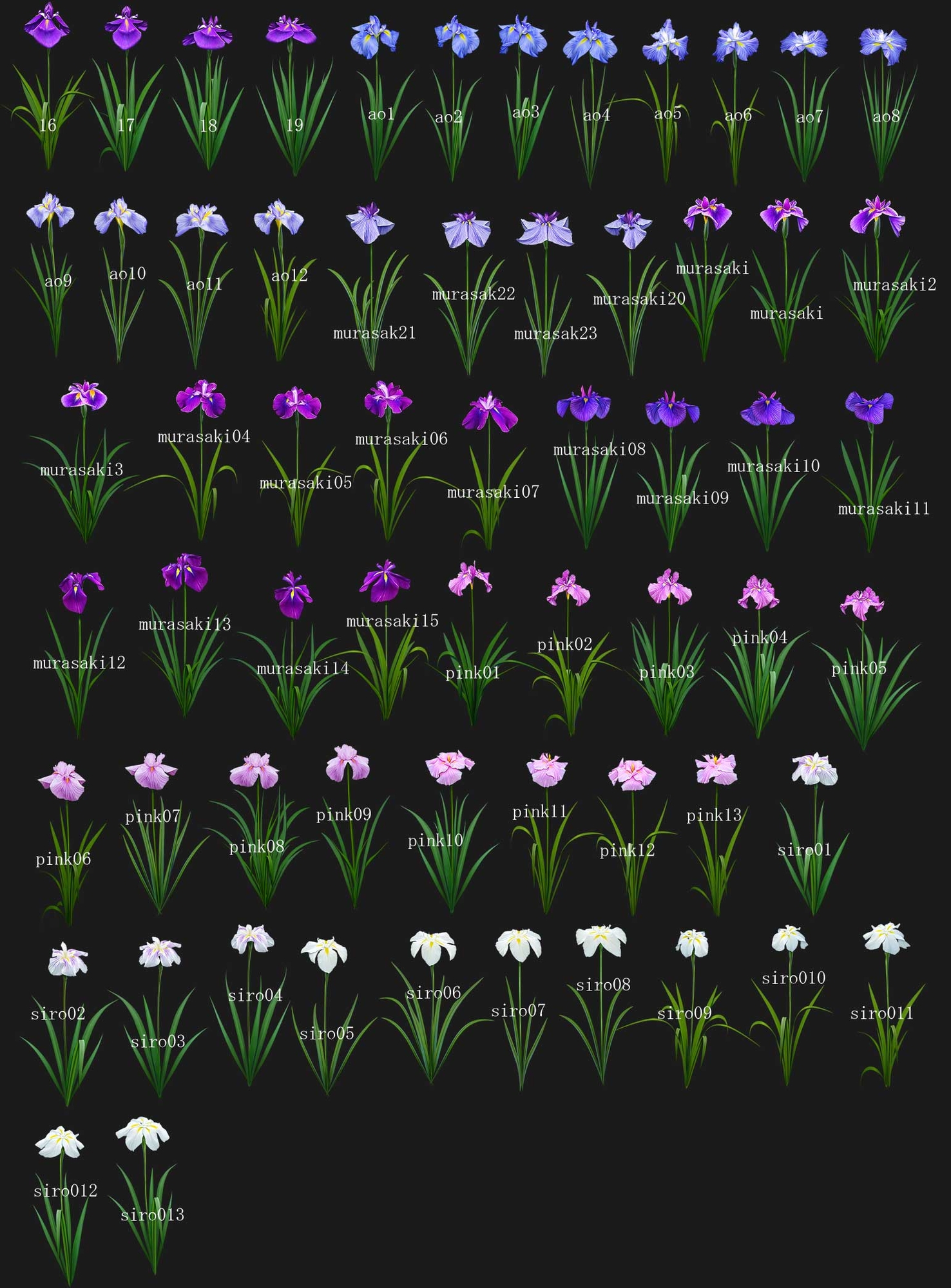 花菖蒲(はなしょうぶ)の素材データです。差分含め紫色が24種類、青が12種類、ピンク13種類、白が13種類です。