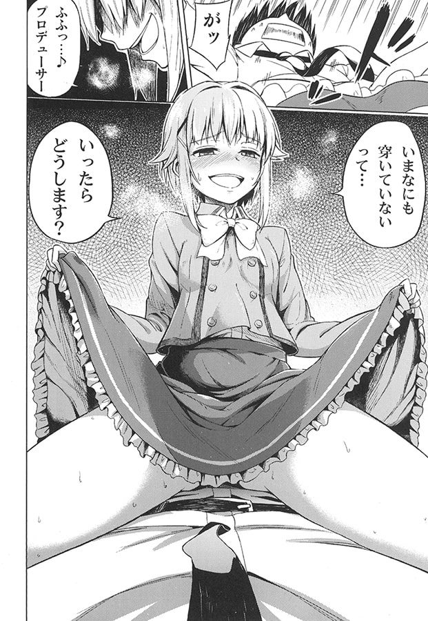 興奮のあまり馬乗りで「いまはなにも穿いていない」と挑発的な台詞を吐く幸子に、Pの理性は耐えられるのか!