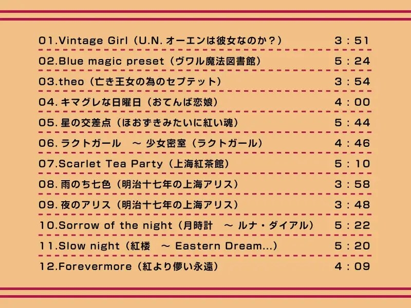 ジャズや、リラックスミュージックの要素を取り入れた、東方紅魔郷のカフェ風アレンジ。 オシャレだけど気取らない、気軽に聞ける全12曲(約55分)です。