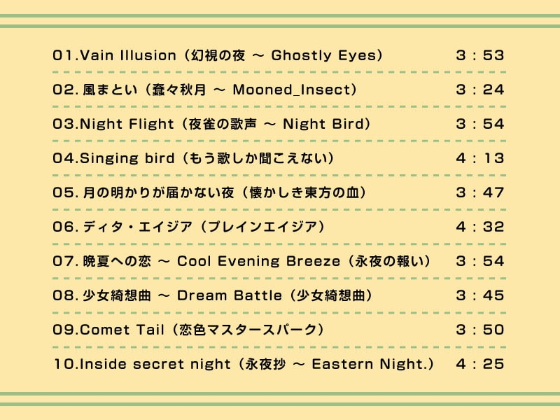 フュージョンを基調にした、都会的で情熱的な東方永夜抄のドライブミュージックアレンジ。 力強さの中に、爽やかさと少しの哀愁を混ぜつつお届けする、全10曲(約39分)です。