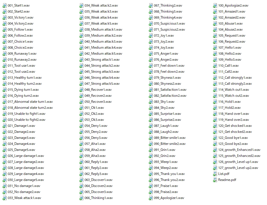 日本のRPG、ACT、ADV、STGなどのゲームでの使用を想定しており、戦闘中の掛け声やダメージ声、日常会話、喜怒哀楽などの1フレーズの汎用的なエモーションボイスが収録されています。