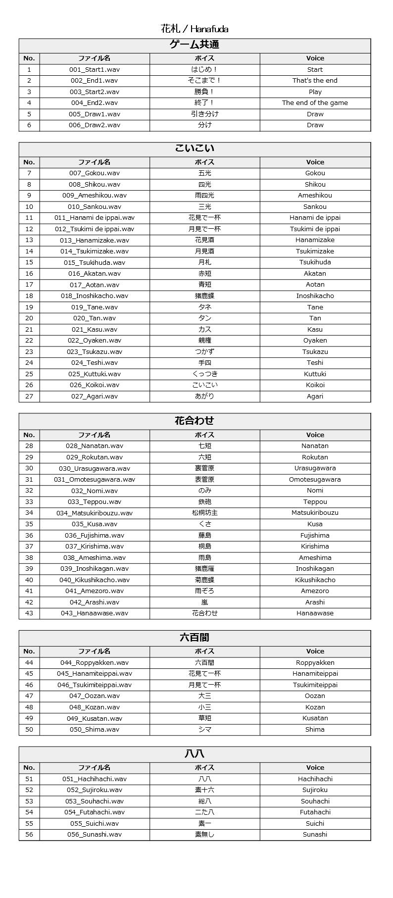 花札におけるこいこいや花合わせの役や掛け声を日本語で収録していま す。