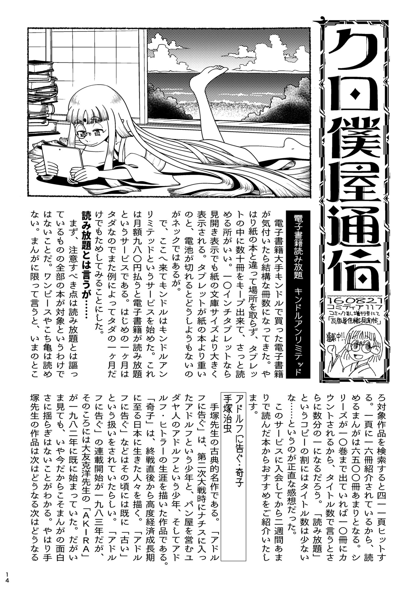 怪しいネット回線商法に引っかかった体験、画家井上○久先生の実演会、住宅街をひたすら歩く話、PU○Gで外国人と共闘した話、十年眠っていた原付を直した話、パソコンをSSDに換装した話、ネットフリックスの映像作品ブラック○ラーやソー○ージ・パーティの話、グーグルマップの場所を当てるゲームge○guesserの話、怪アニメカ○トボーグの話、傑作アニメケムリ○サ感想について文字みっしり90頁でお送り致します。