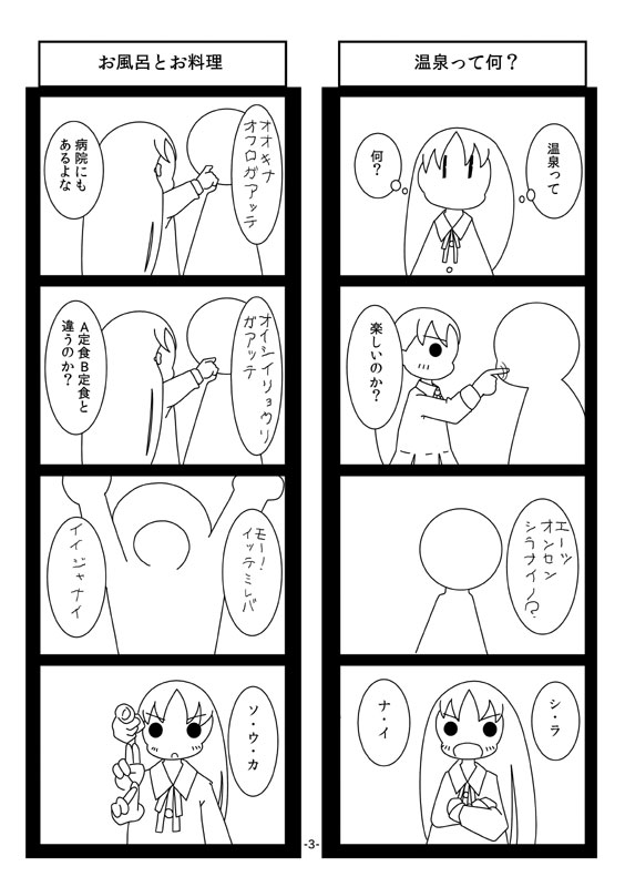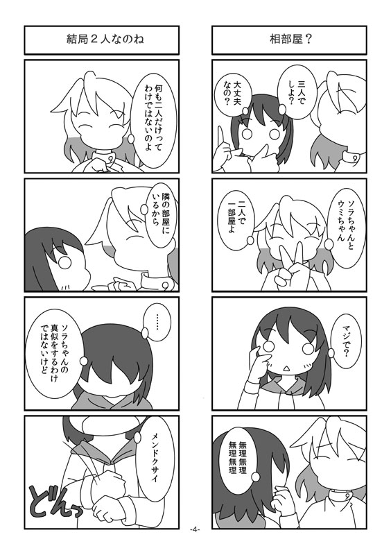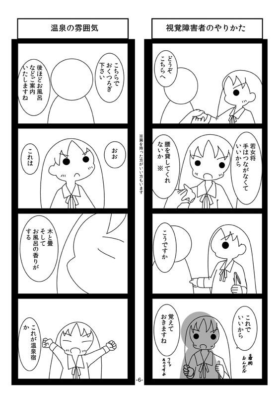 視覚障害者のソラと聴覚障害者のウミ、障害者である二人は毎日ちょっとした不便にもめげるなく不自由で幸せな人生を送っています。今回はその2人が温泉に行く話です。モノクロ28ページ