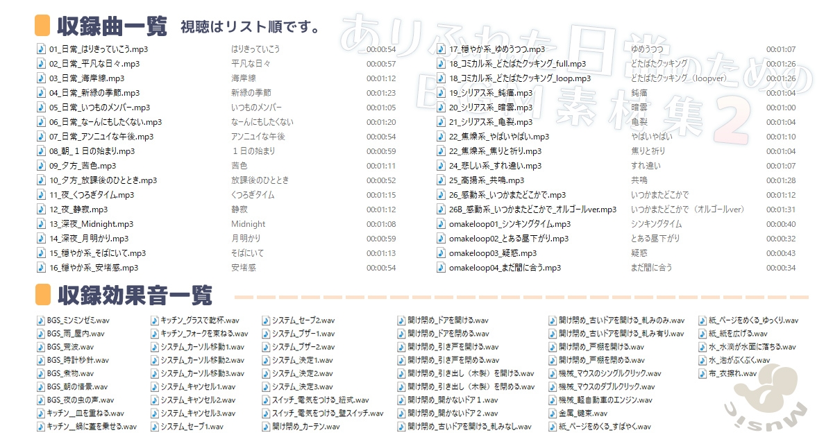 BGM以外にも日常シーンで使えそうなループ対応BGS&効果音&システムSEを合計50種類(差分2種類を含む)収録しています。