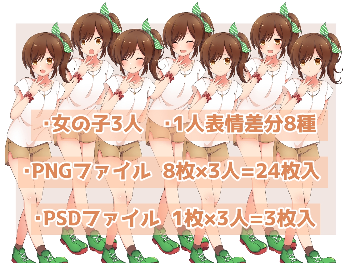 PNG:キャラクター3人×表情差分8枚=計24枚、背景透過済、統合済、全身立ち絵