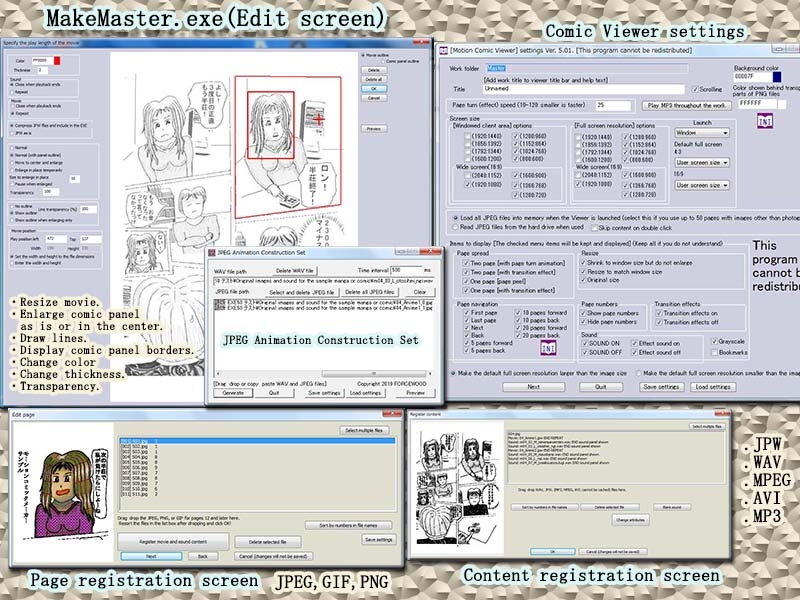 WAV and JPW (the proprietary JPEG animation format for this software) files can be included in the ComicViewer.exe