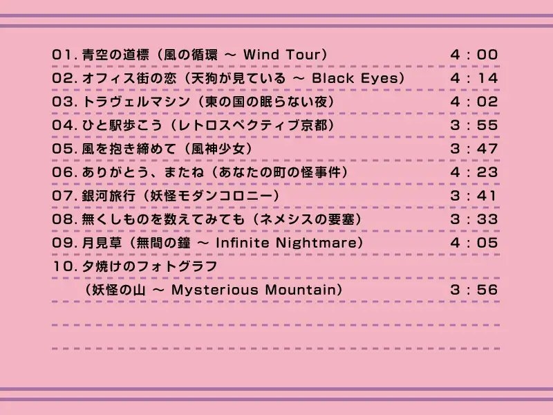 スムースジャズやリラックスミュージックをはじめとする都会的でオシャレな要素を取り入れた、東方文花帖/ダブルスポイラーのカフェ風アレンジ。親しみやすいメロディやリズムに含まれた、少し懐かしい響きも感じて頂ける、全10曲(約39分)です。