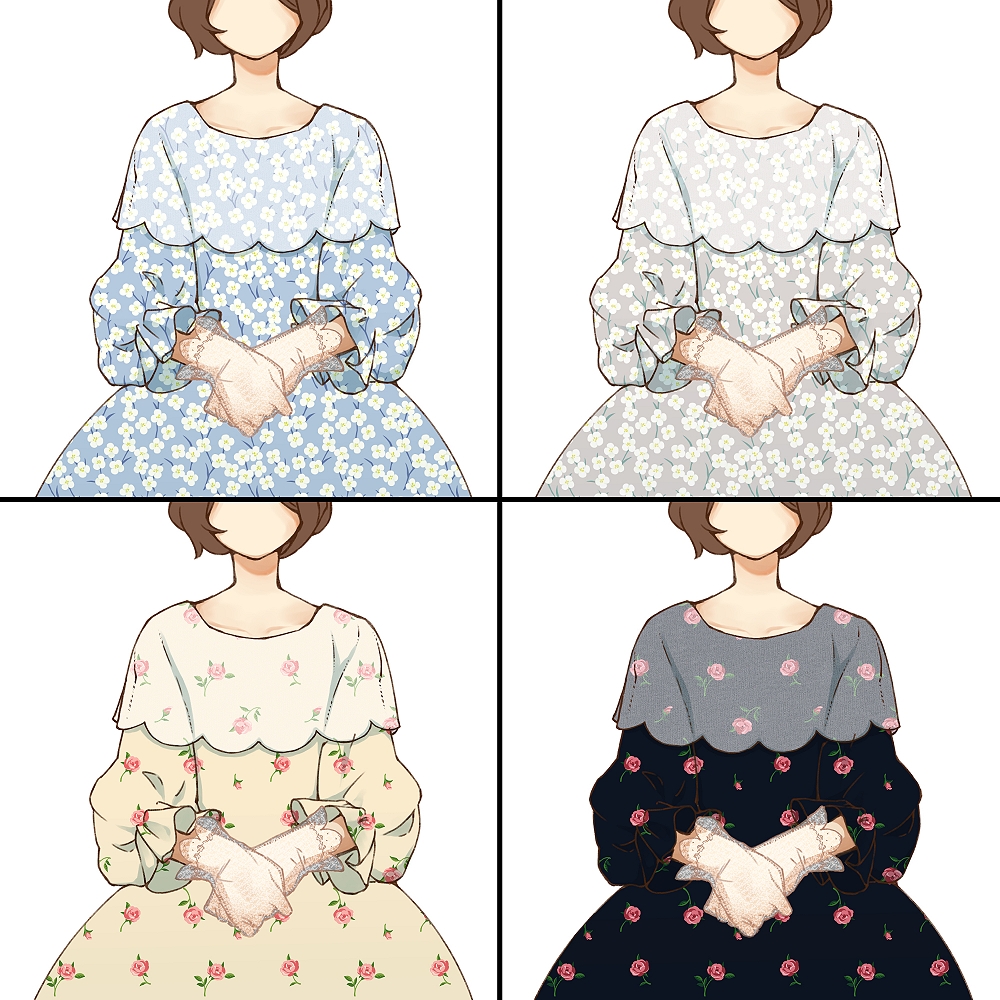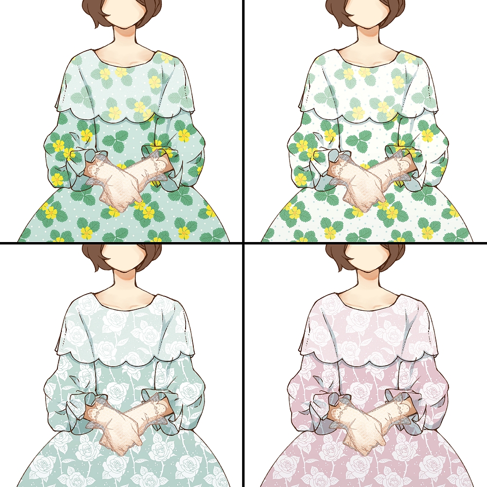 サンプル画像はドレスにそのまま花柄を使用したものと、1500×1500pxのキャンバスにそのまま花柄を貼り付けたものです。大きさなど参考にしてください。