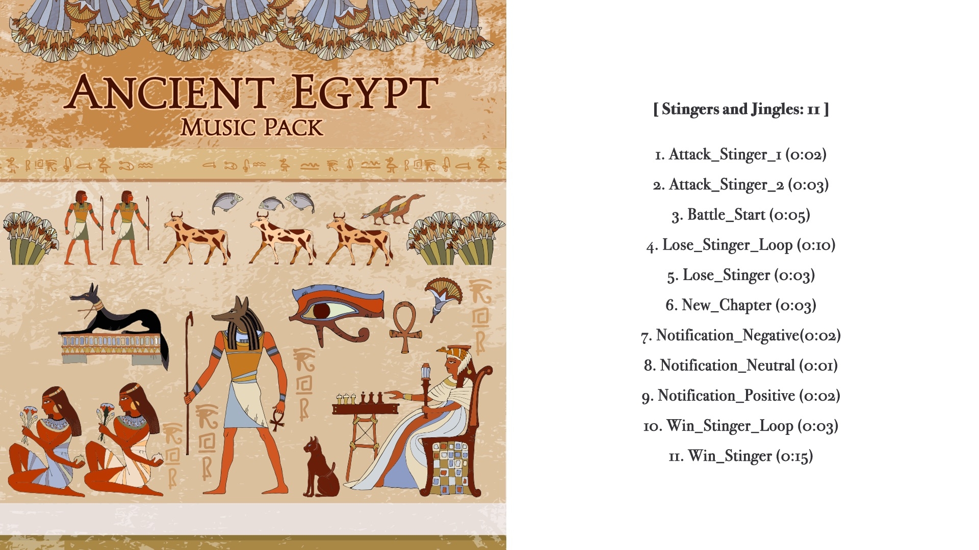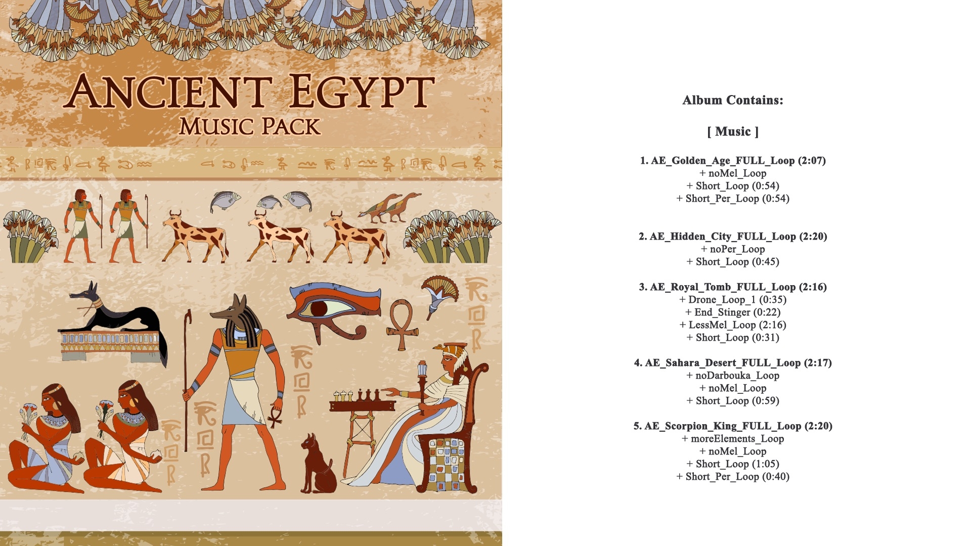古代エジプト文明を表現したBGM素材集は、まさに、古代文明の謎を解くピラミッドのダンジョンを歩いたり、恐ろしいミイラとのバトル、灼熱の砂漠を探索するシーン、そして王家の墓にまつわる壮大なストーリーを感じさせる物語、背筋が凍るような恐ろしくミステリアスな雰囲気をハイクオリティなBGMで演出します。