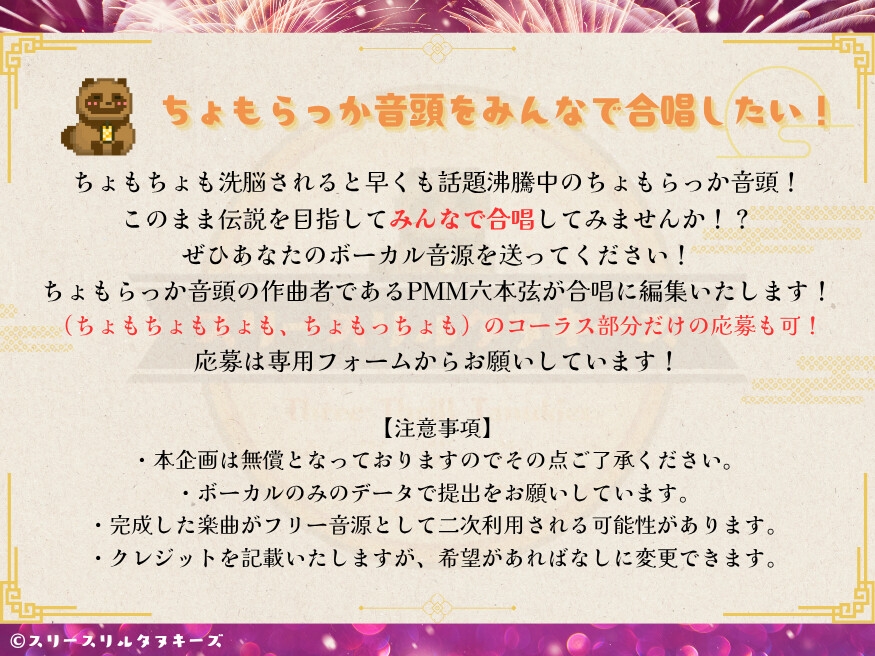 本編をフルで送ってくれてもいいし、ちょもちょもコーラスだけの参加も大歓迎です!