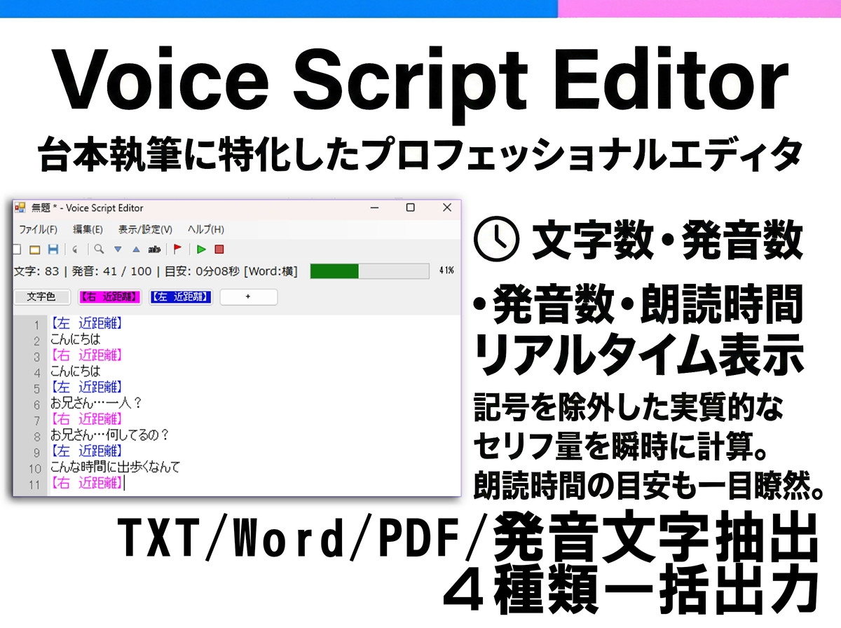 ・発音のみテキスト (.txt): ト書きや記号をすべて削除した「声優さんが読むセリフだけ」のデータを自動生成します。