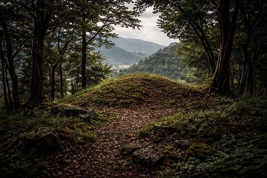 尾根を越え、塚をかすめ、そして墓地の方向へ伸びている。