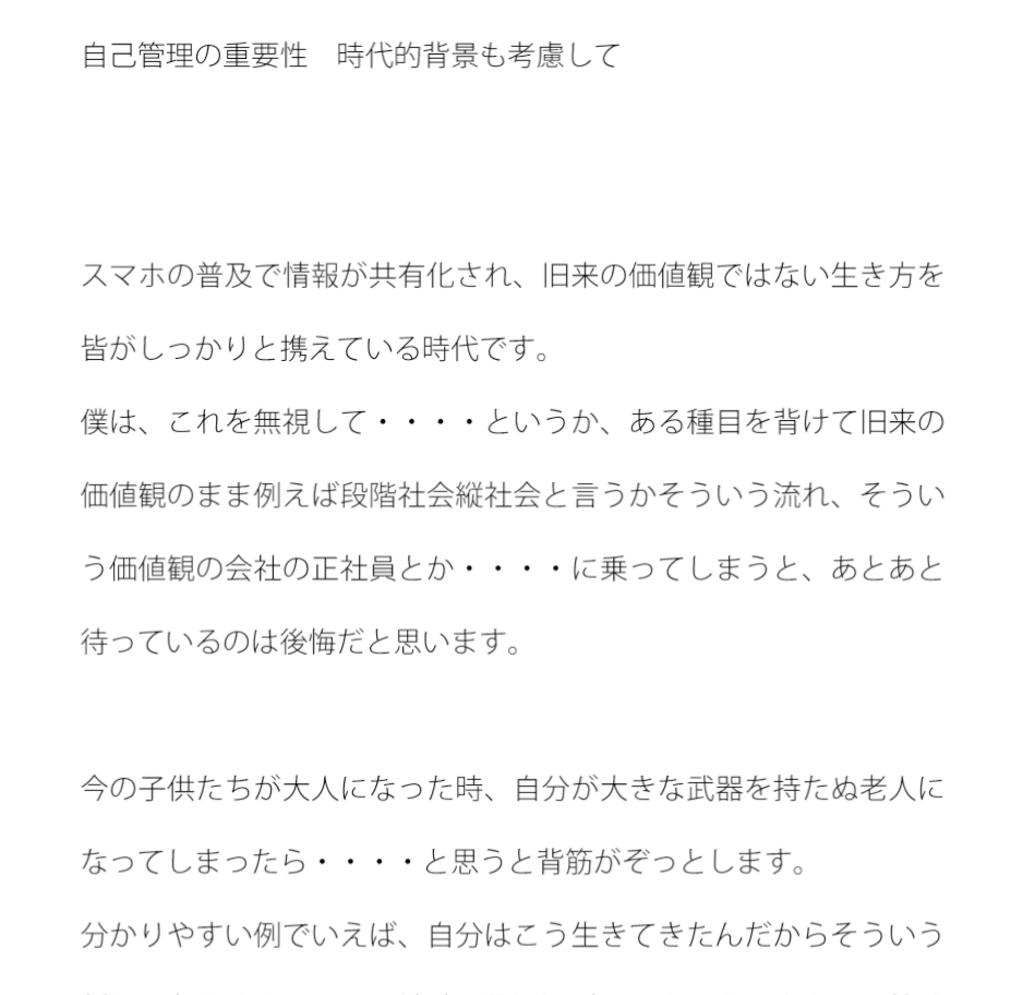 僕は、これを無視して・・・・というか、ある種目を背けて旧来の価値観のまま例えば段階社会縦社会と言うかそういう流れ、そういう価値観の会社の正社員とか・・・・に乗ってしまうと、あとあと待っているのは後悔だと思います。