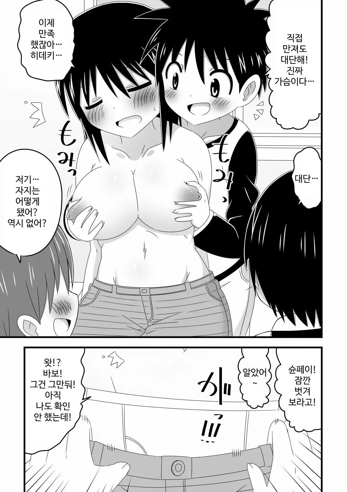 すると3人とも涼くんの体に興味津々になり胸を揉んだり、ズボンを下ろして下半身を確認しようとする。