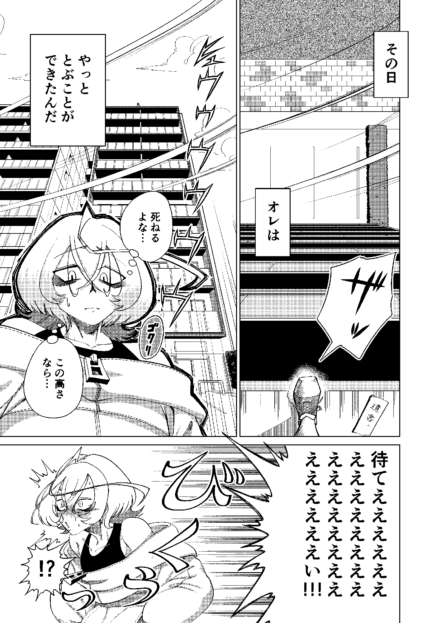 ビルの上で飛び降りる準備をしている少年のもとに、諸制服の謎の女性が現れる。