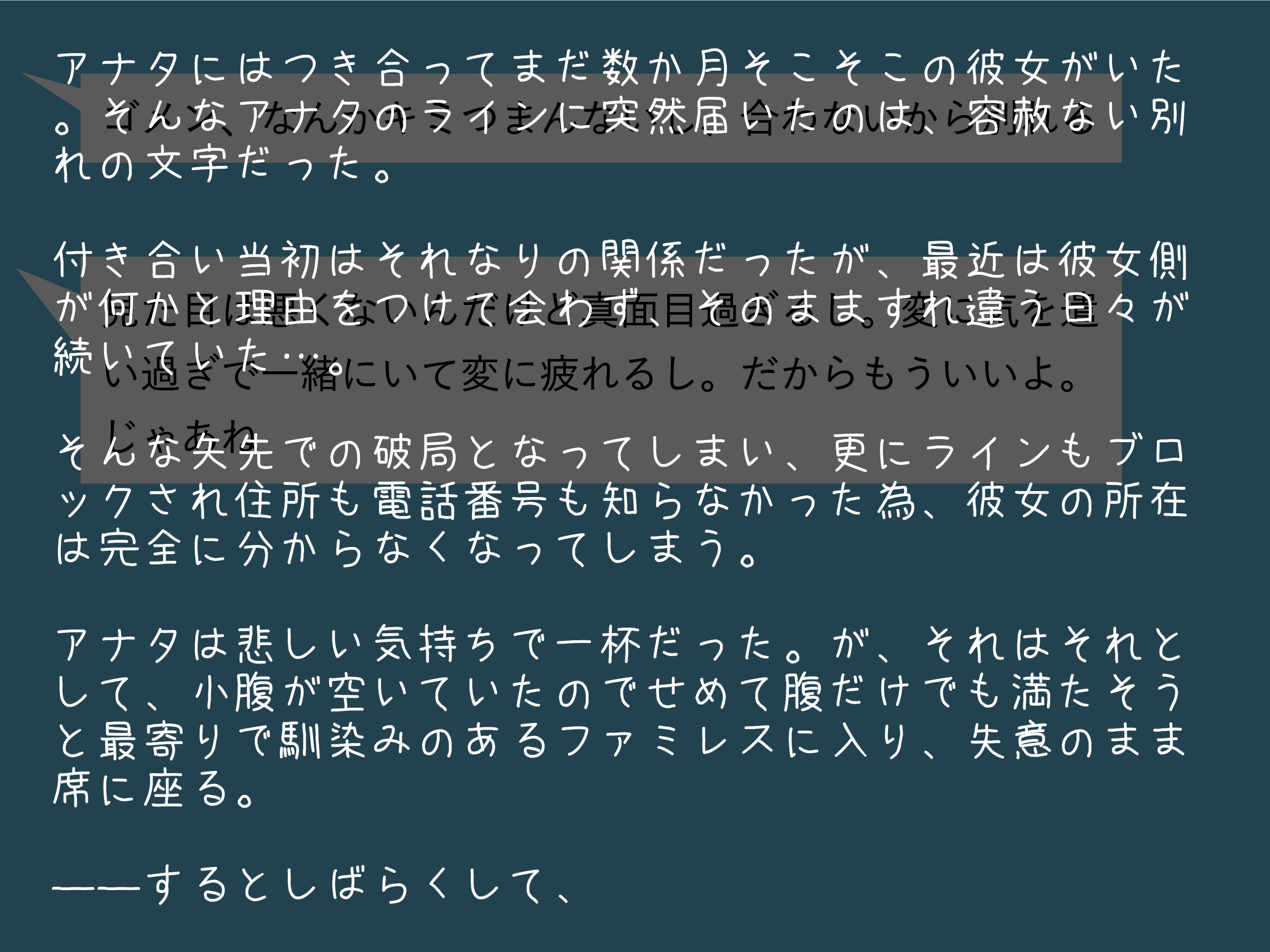 おまけに数か月以上『アレがご無沙汰』という世知辛い事情も聞き、失恋明けのアナタに中々かける言葉も見つからなかったが、話の途中で元カノはふとアナタのとある部分に目を付けてしまう。