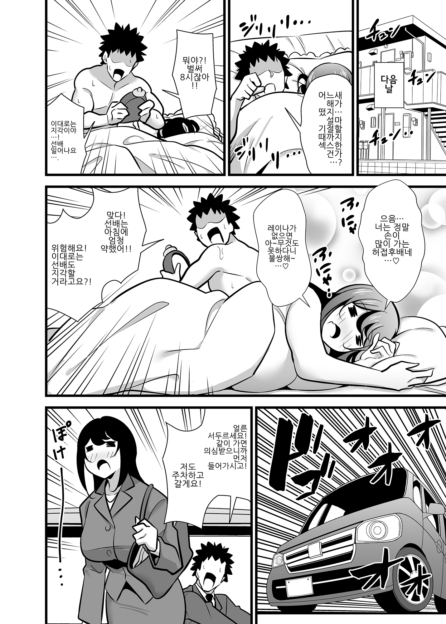 女上司を先に会社に送ることで何とか間に合ったが、後輩の方は遅刻してしまう。