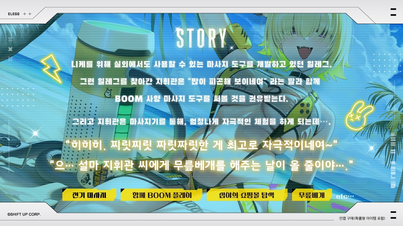일레그가 있는 공방을 찾아온 지휘관은, "꽤 피곤해 보이시네여?"라는 말과 함께 마사지 도구를 써볼 것을 권유받는다.