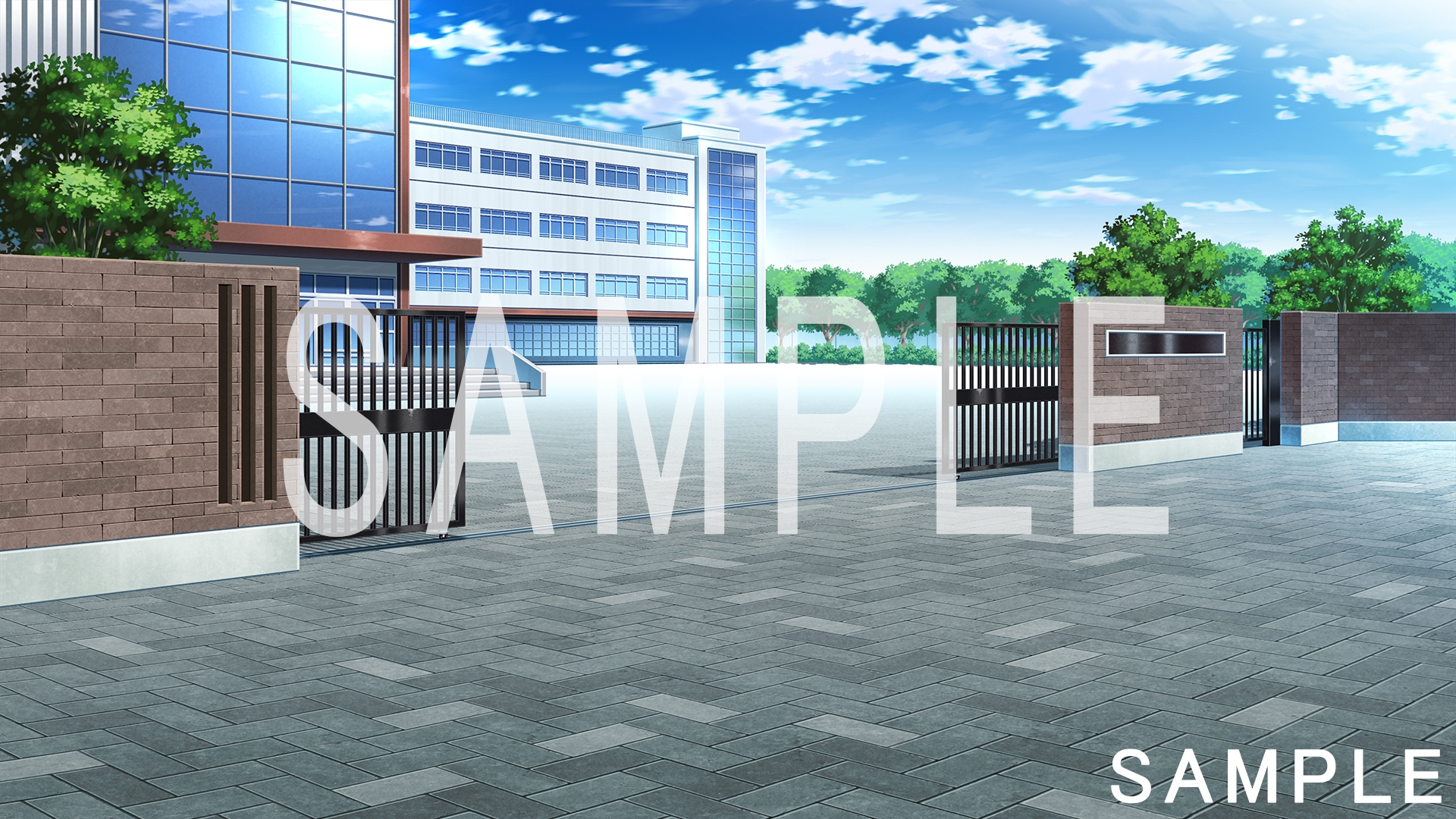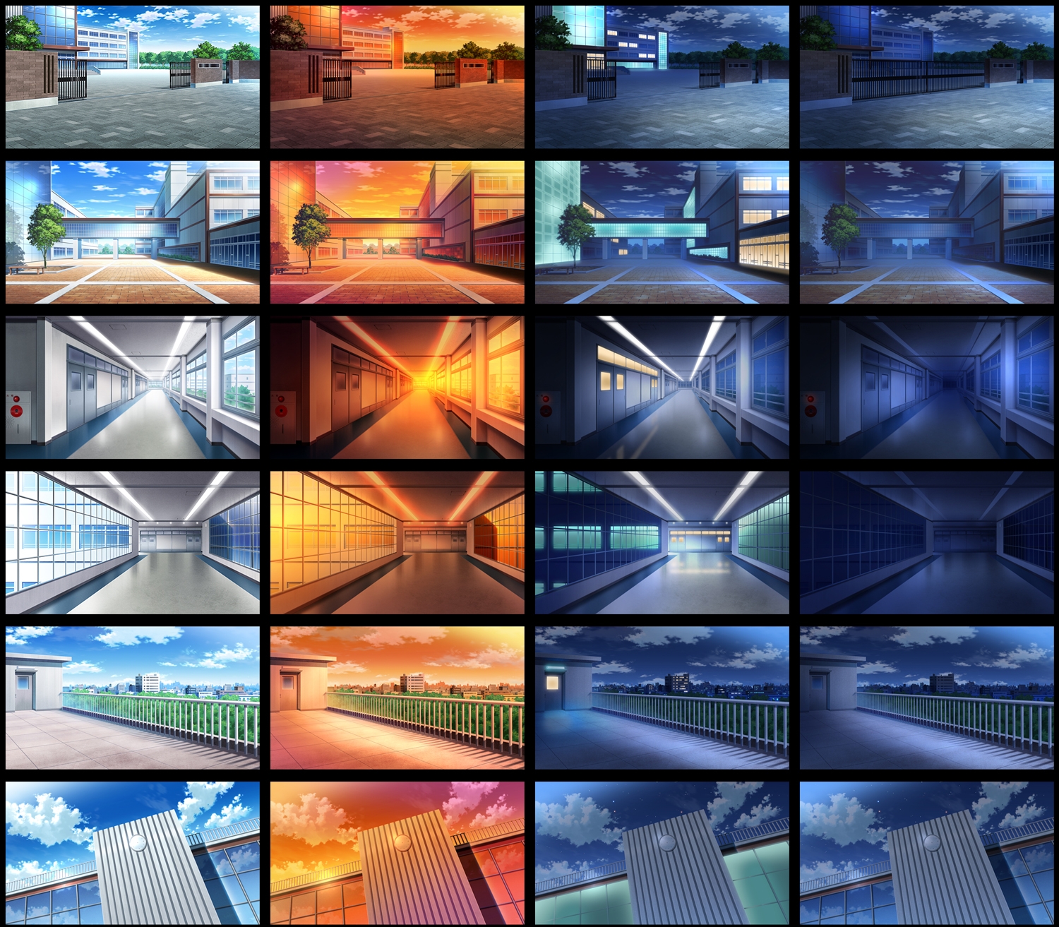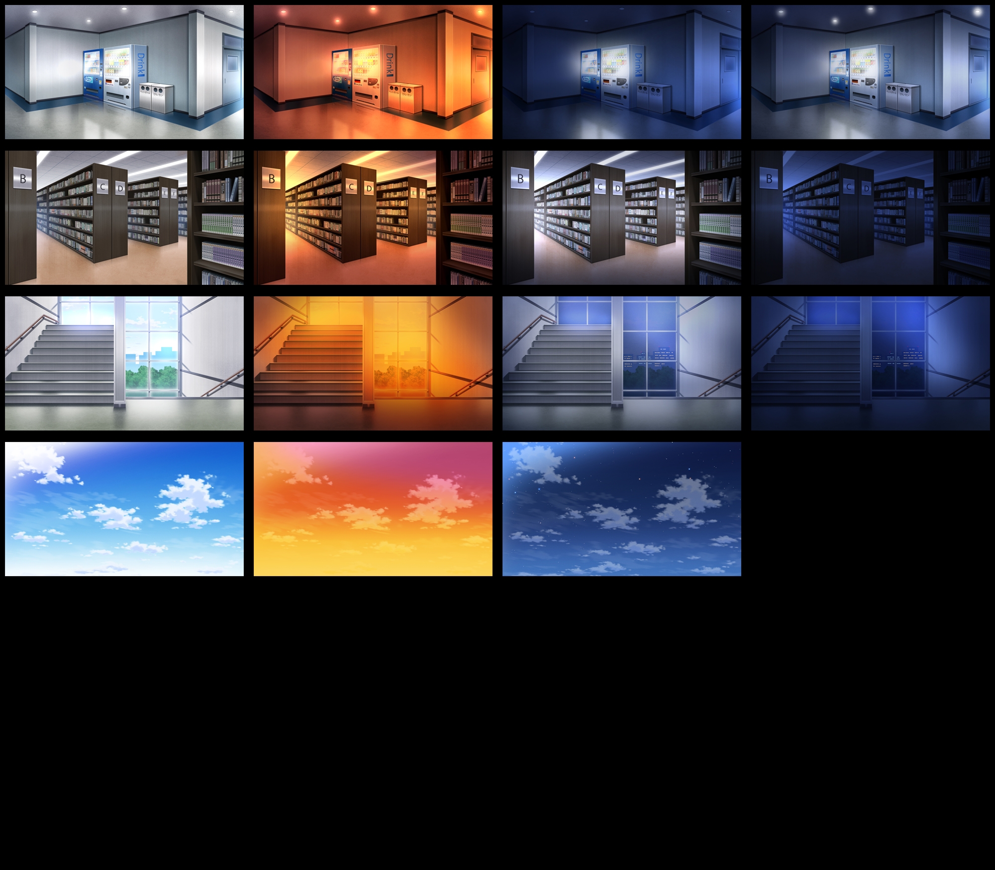 校門前/中庭/廊下/渡り廊下/屋上/校舎正面見上げ/自販機前/図書室/階段/空