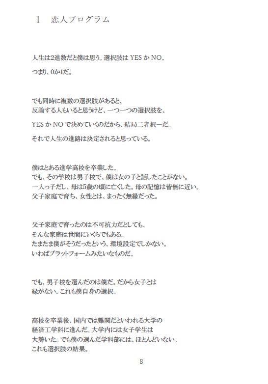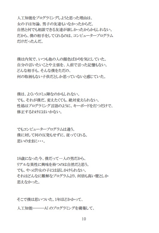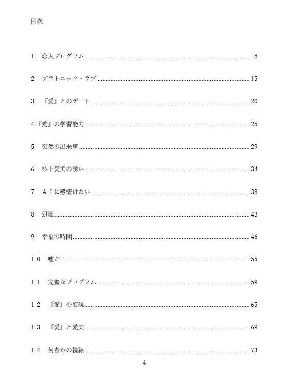 そんな彼が、人工知能をプログラミングして、理想の恋人を造った。彼女の名は『愛』。その存在は、