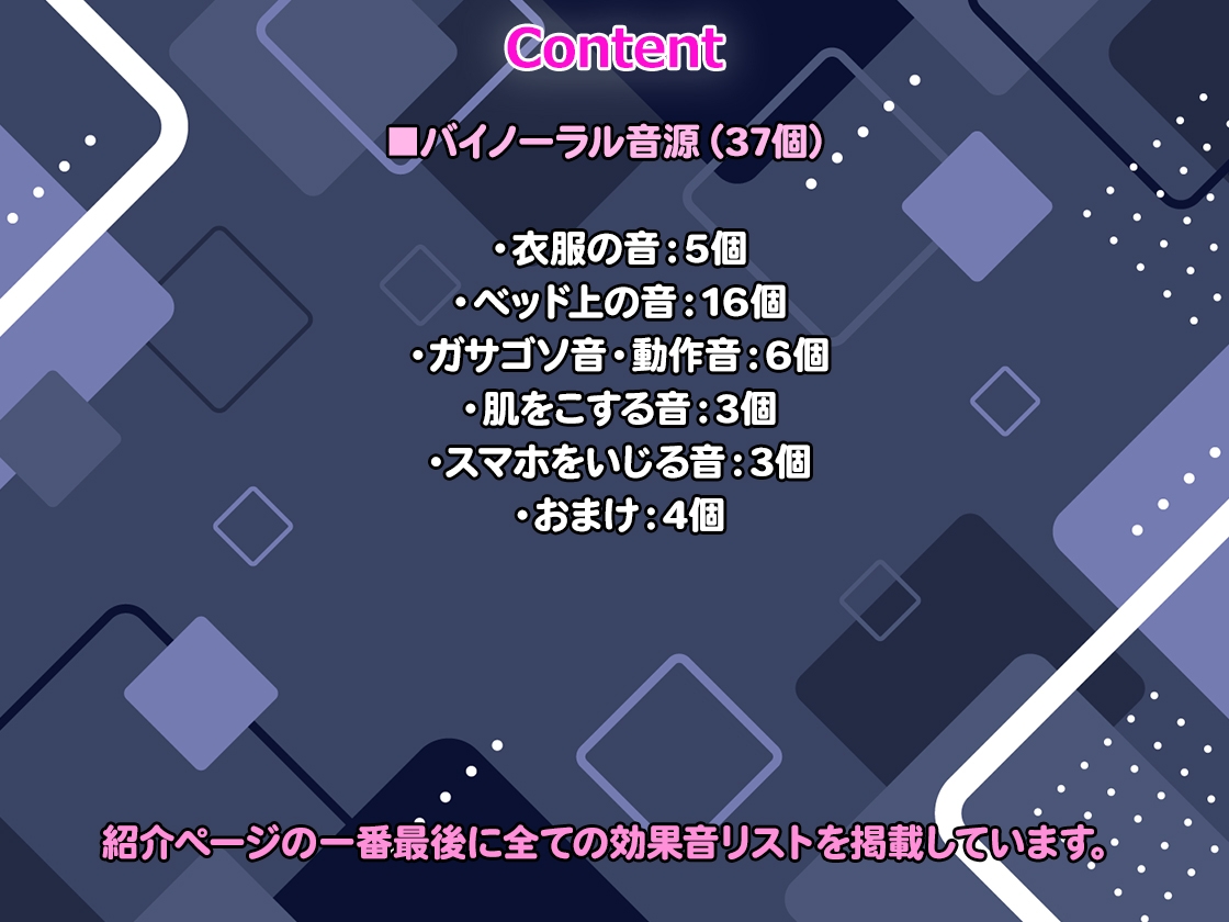本作はバイノーラルマイクで収録した衣服の音やベッドの音などを37個収録した素材集です。