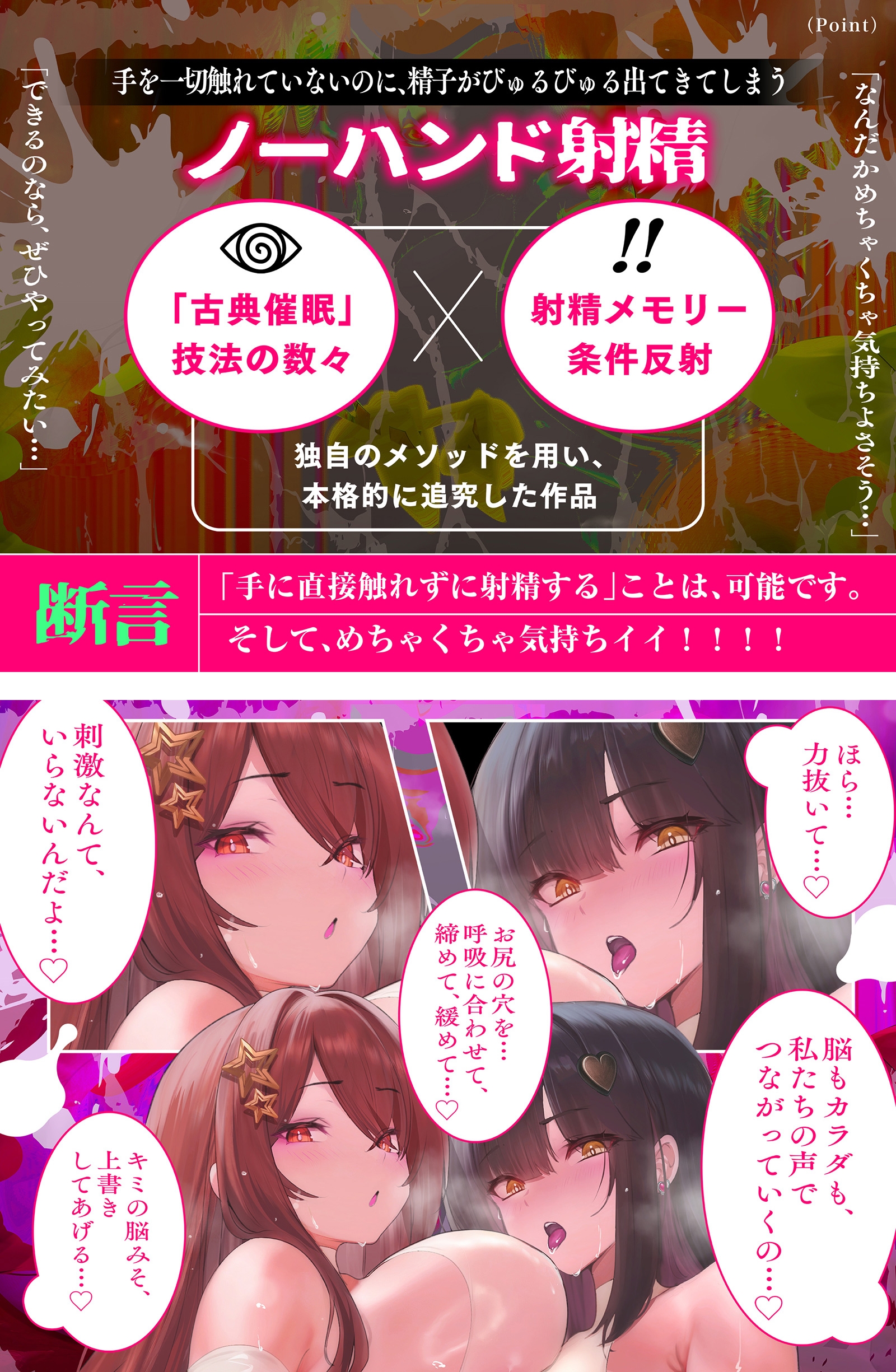 本作品は、本気で「ノーハンド射精」をする方法について、「古典催○」の技法の数々と「射精メモリー条件反射」という独自のメソッドを用い、本格的に追究した作品です。
