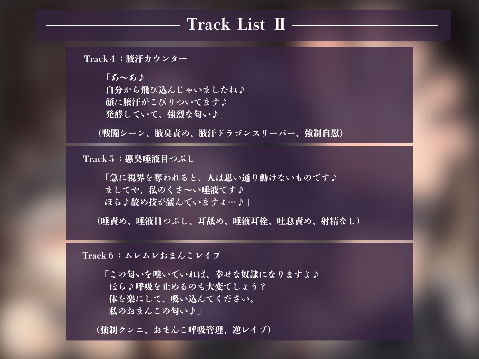 (戦闘シーン、腋臭責め、腋汗ドラゴンスリーパー、強○自慰)