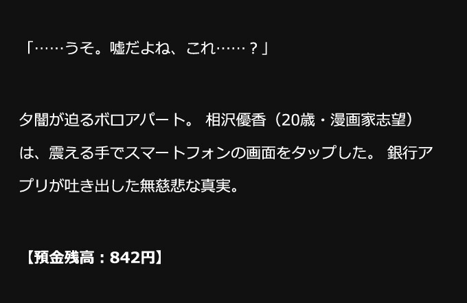 相沢優香(20歳・漫画家志望)は、震える手でスマートフォンの画面をタップした。