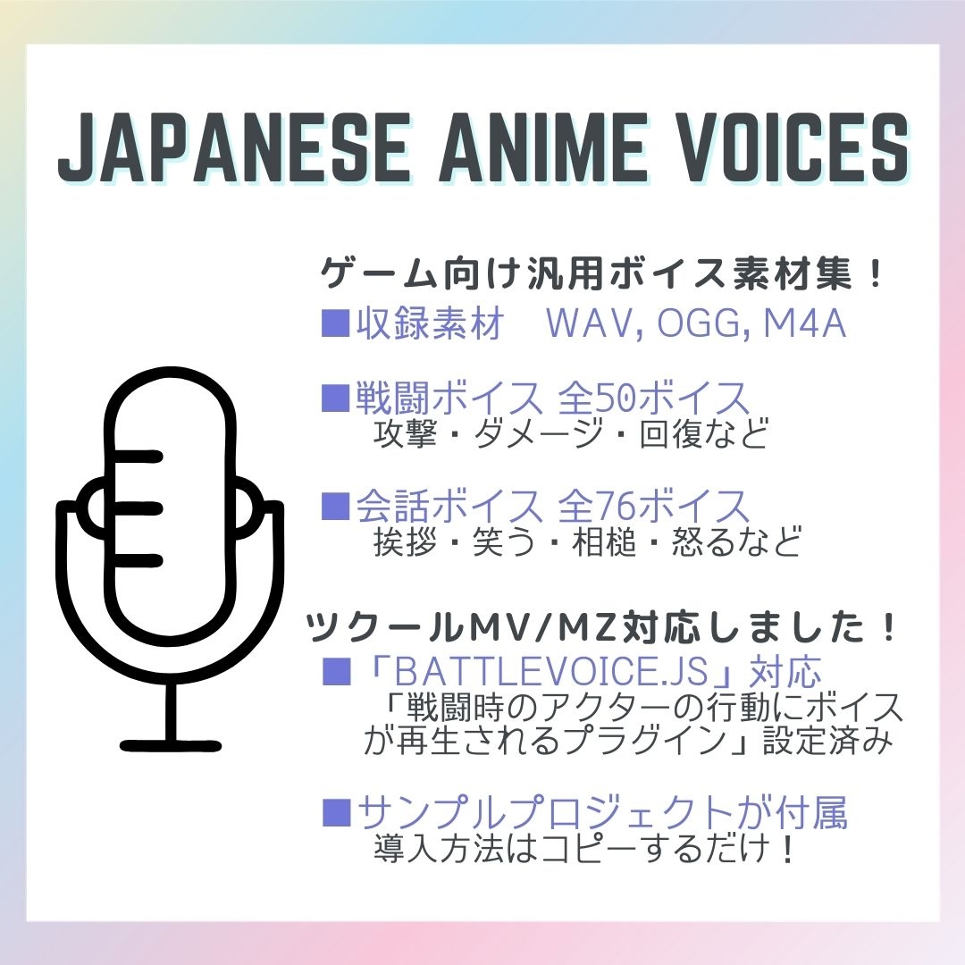 「戦闘時にキャラボイスを再生するプラグイン」に対応・コマンド設定済みのため、各データをコピー&ペーストするだけですぐに戦闘時のキャラクターボイスが再生できます。