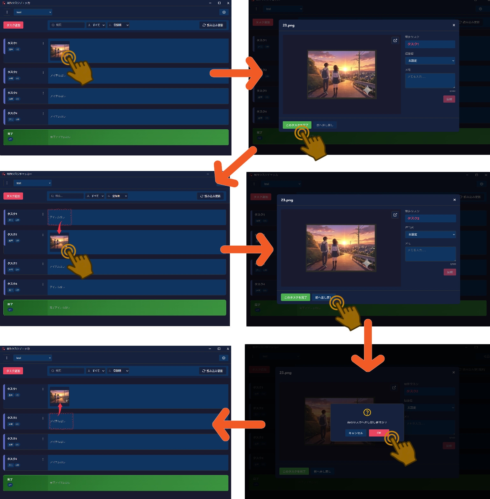 フォルダを指定するだけで、中の画像ファイルを自動で読み込み、サムネイル一覧で表示。あとは「ラフ」「線画」「着色」「仕上げ」など、あなたの制作工程に合わせたタスクを作成するだけ。