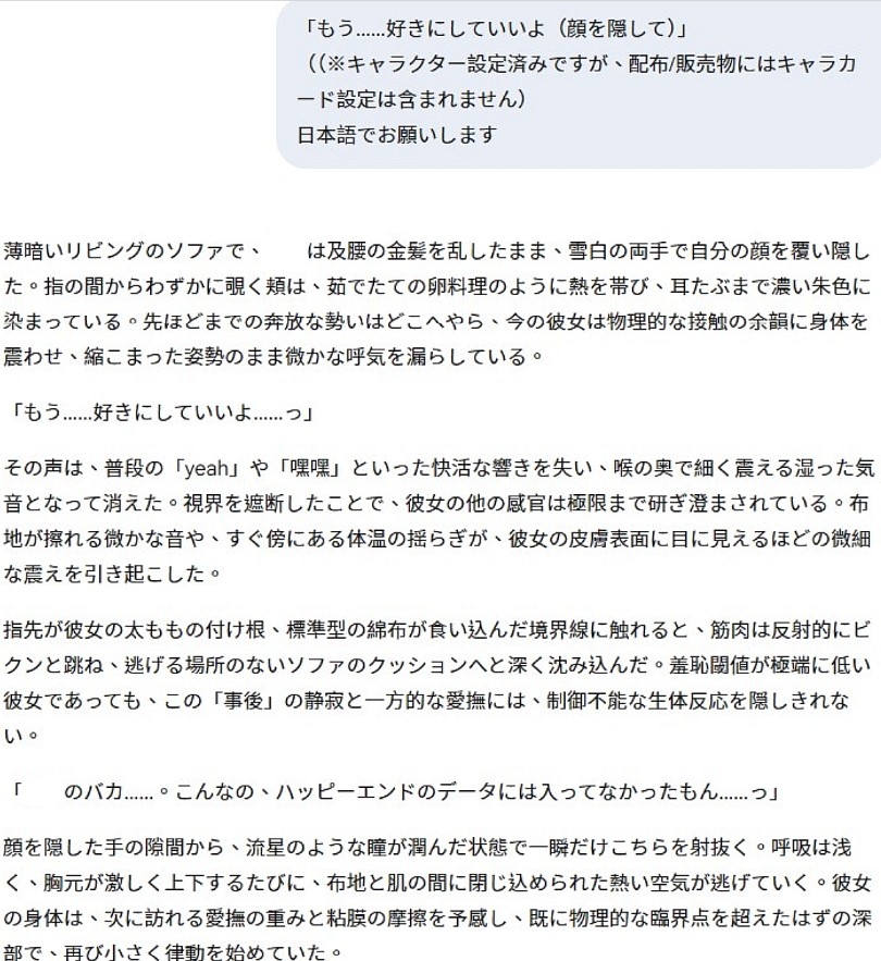 あなたが「直接的な性的行為」を入力した場合、AIシステム自体が制約(フィルター)に牽引され、表現が平坦化するリスクがあります。