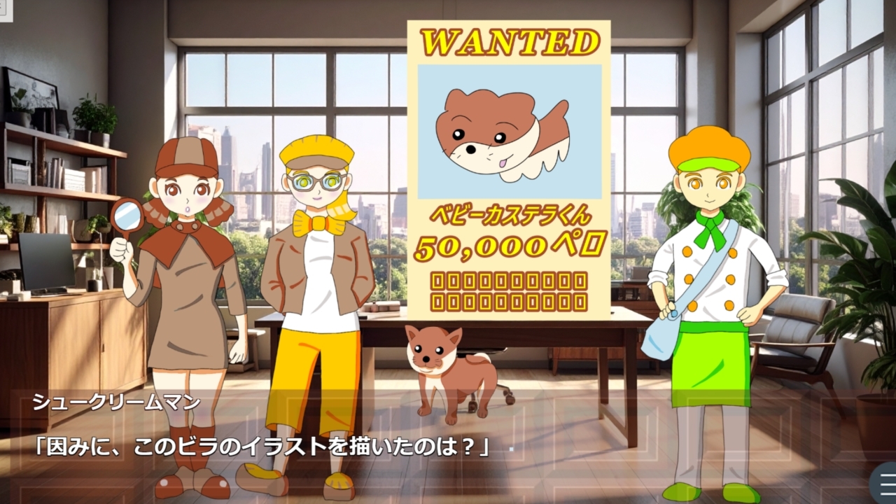 プレイヤーは、シュークリームマンとなって、カヌレ探偵の助手的存在として、事件解決のサポートを行います。
