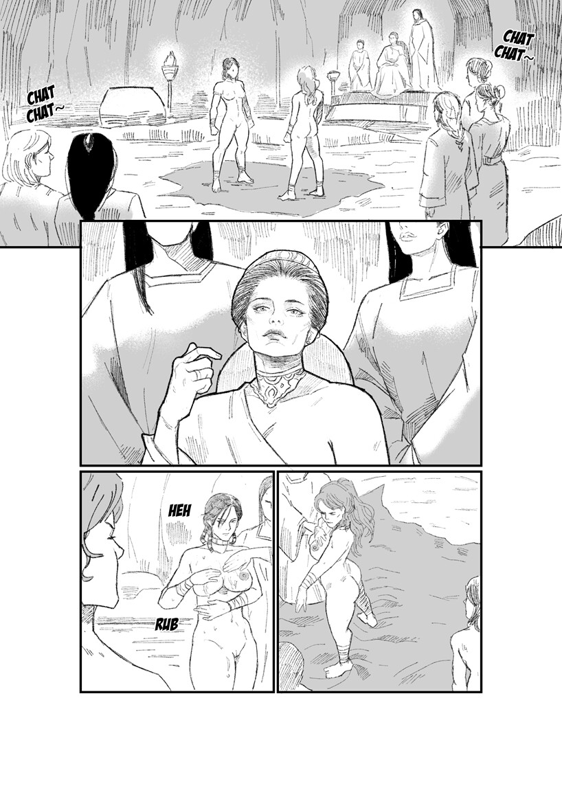 Watched by Queen Penthesilia and their fellow Amazons, the two finest warriors, Oreitheia and Antiope, are anointed with sacred oil and engage in a grueling wrestling contest to determine the better fighter. The winner will be the one worthy to be called War Goddess!